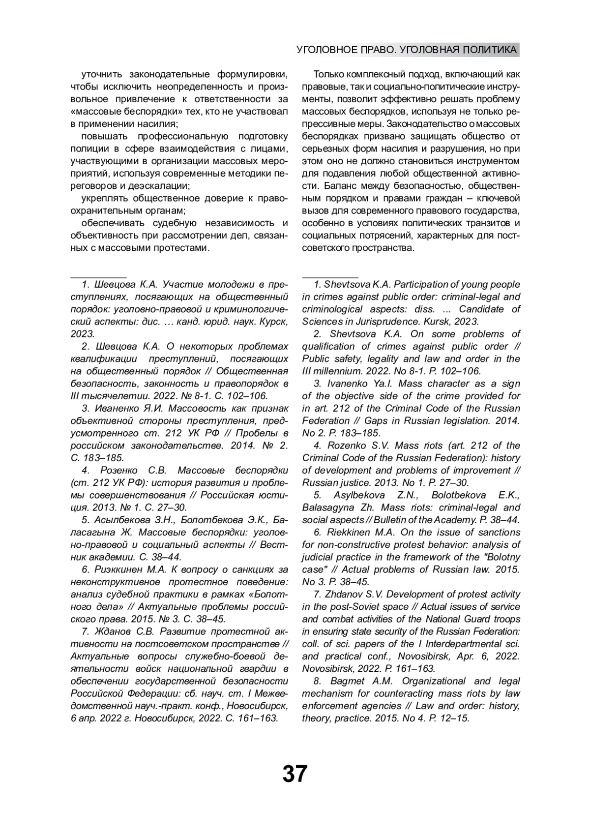 1. Шевцова К.А. Участие молодежи в преступлениях, посягающих на общественный порядок: уголовно-правовой и криминологический аспекты: дис. … канд. юрид. наук. Курск, 2023. EDN: XZWRTY