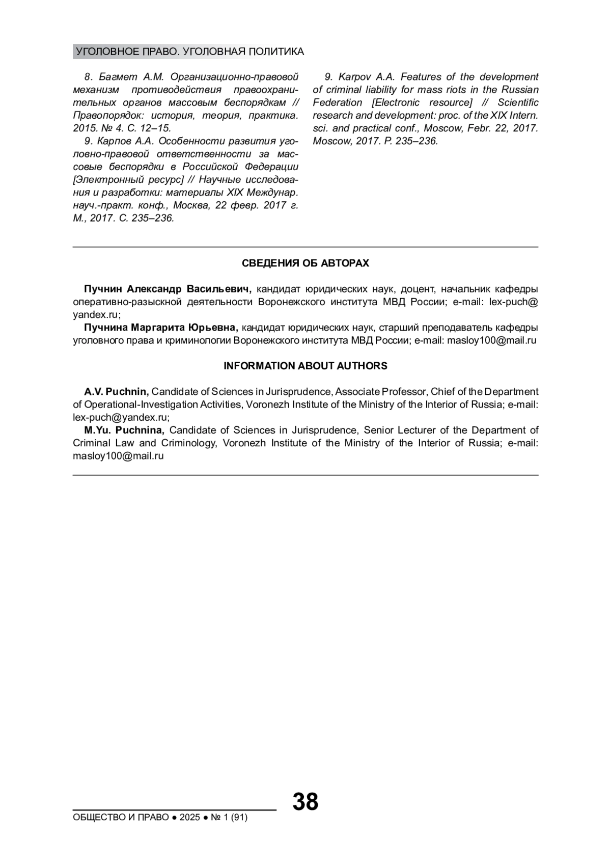 9. Карпов А.А. Особенности развития уголовно-правовой ответственности за массовые беспорядки в Российской Федерации [Электронный ресурс] // Научные исследования и разработки: материалы XIX Междунар. науч.-практ. конф., Москва, 22 февр. 2017 г. М., 2017. С. 235-236. EDN: YKBFSL