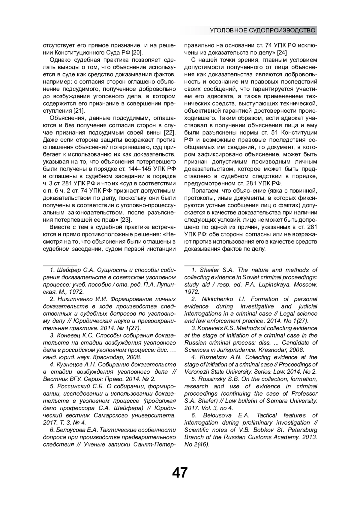 13. Балакшин В.С. Объяснение как доказательство в уголовном и административном судопроизводстве // Российский юридический журнал. 2012. № 5. EDN: NRUSQE