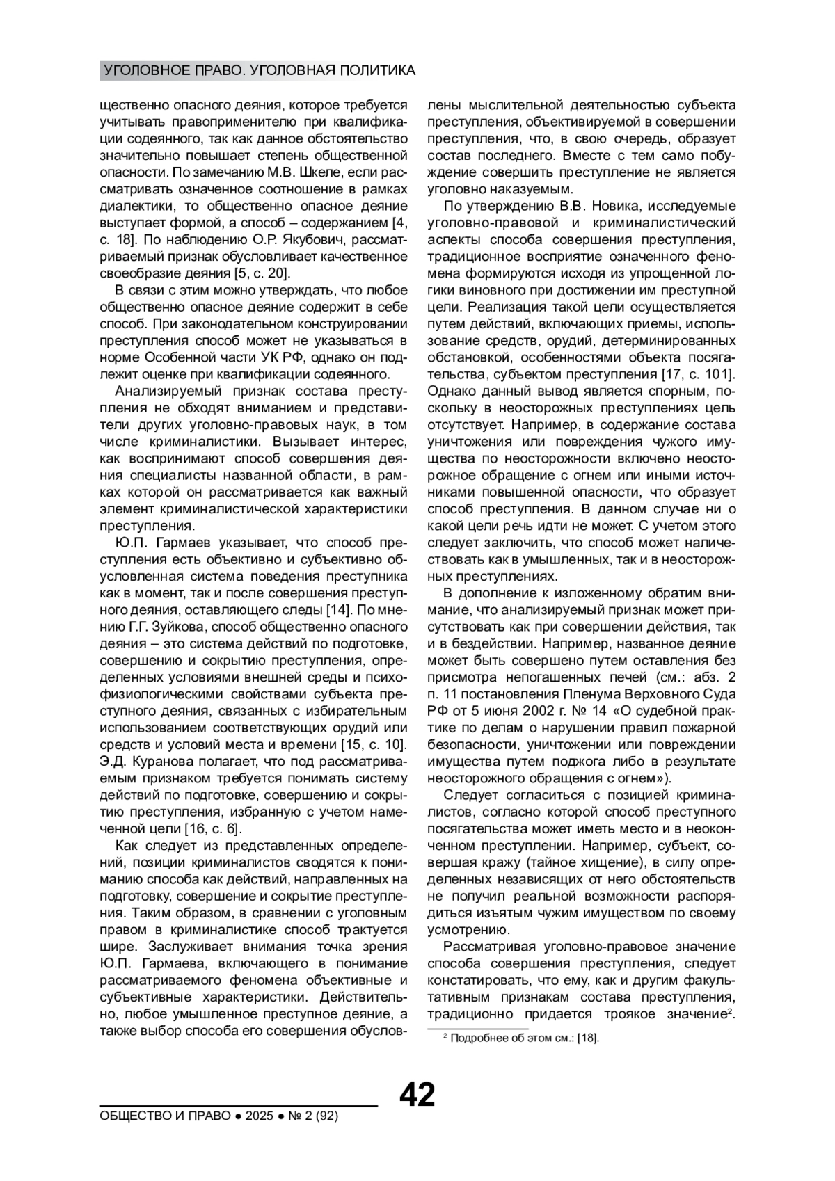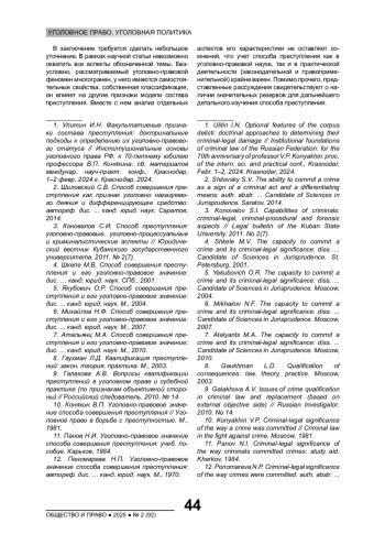 2. Шиловский С.В. Способ совершения преступления как признак уголовно наказуемого деяния и дифференцирующее средство: автореф. дис…. канд. юрид. наук. Саратов, 2014. EDN: ZPJRXZ