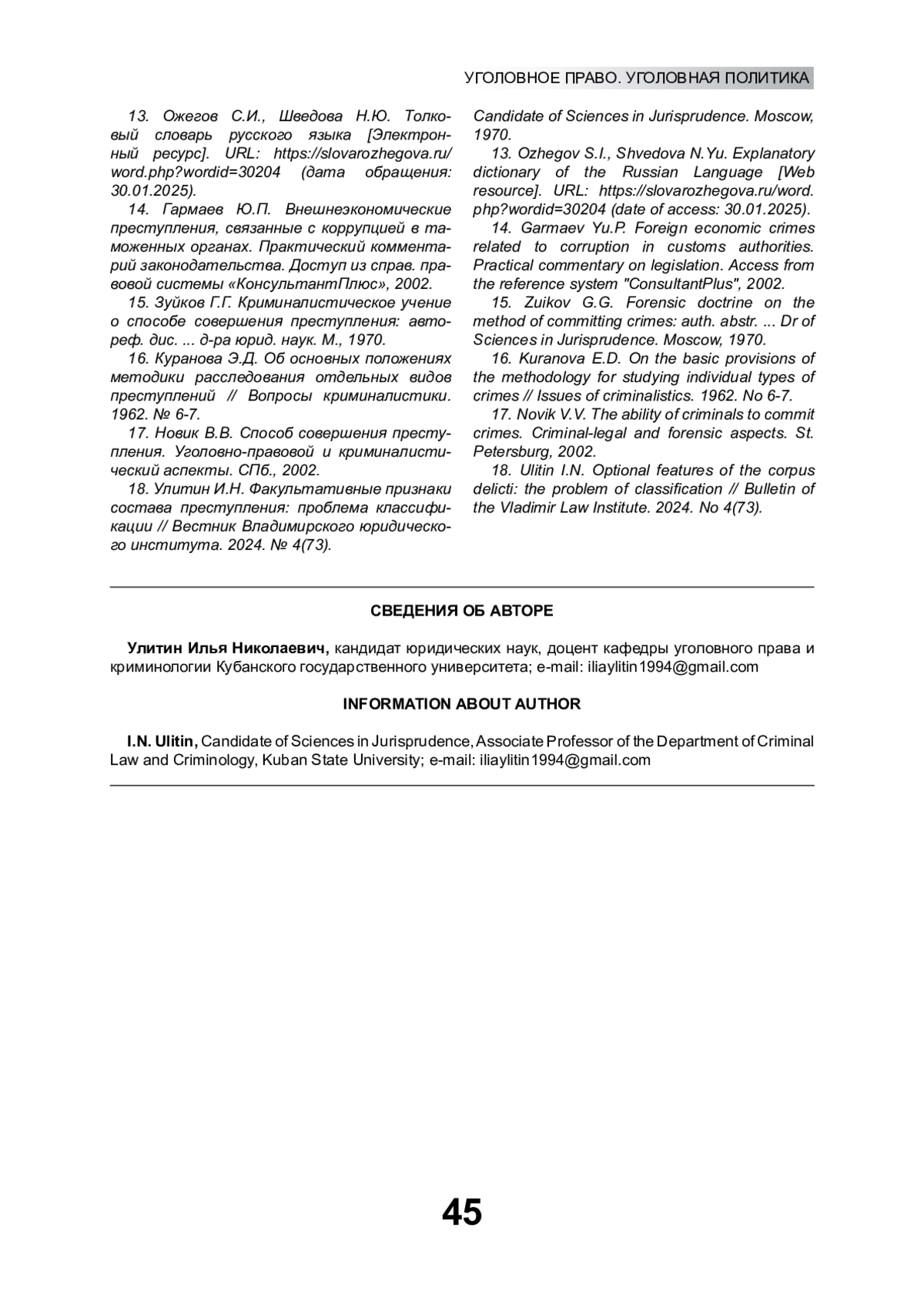 18. Улитин И.Н. Факультативные признаки состава преступления: проблема классификации // Вестник Владимирского юридического института. 2024. № 4(73). EDN: HCJTEH