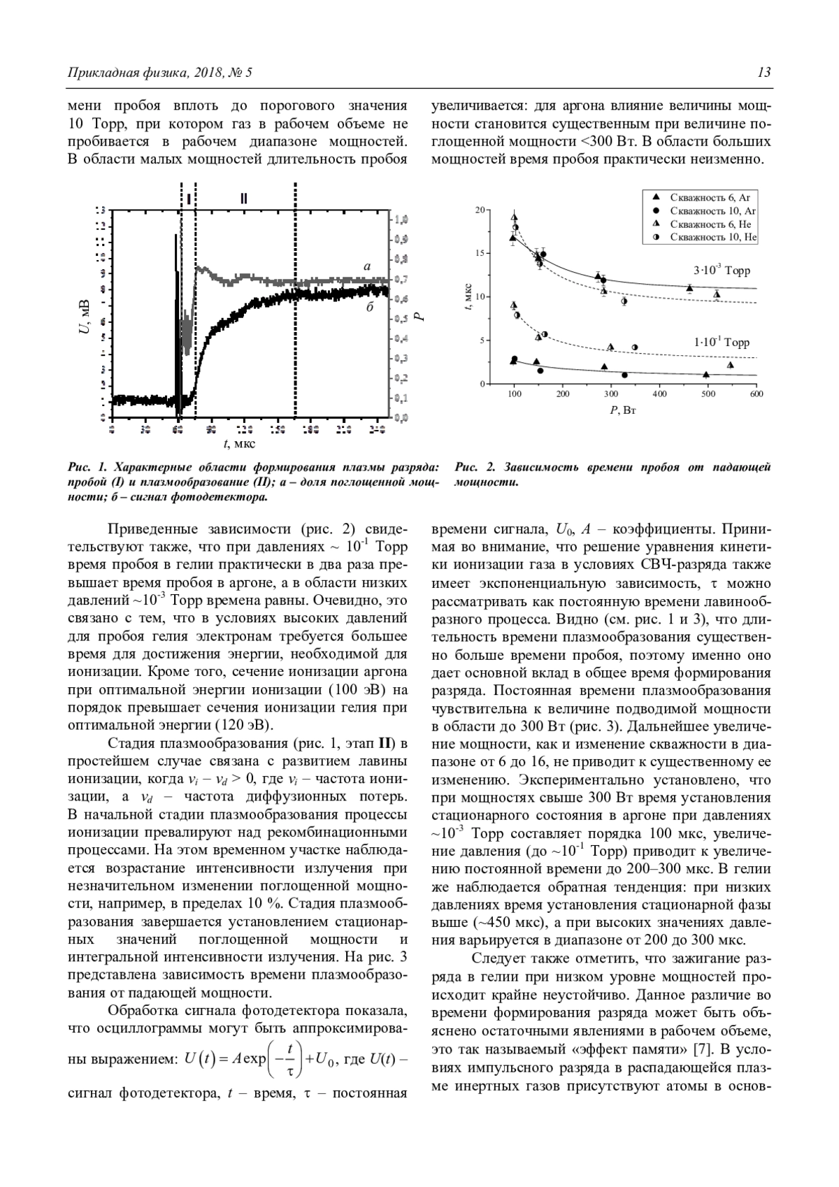 Полученные зависимости времени пробоя от давления показывают, что при превышении давления в ~5×10-3 для аргона (~1×10-2 для гелия) пробой рабочего газа существенно облегчается, и время пробоя уменьшается на порядок. Уменьшение времени пробоя сопровождается увеличением светоотдачи плазмообразующего газа. При этом происходит скачкообразное увеличение поглощаемой мощности до 90–95 %. Увеличение вкладываемой в разряд мощности в широком диапазоне изменений скважности также приводит к уменьшению характерных времен формирования разряда.
