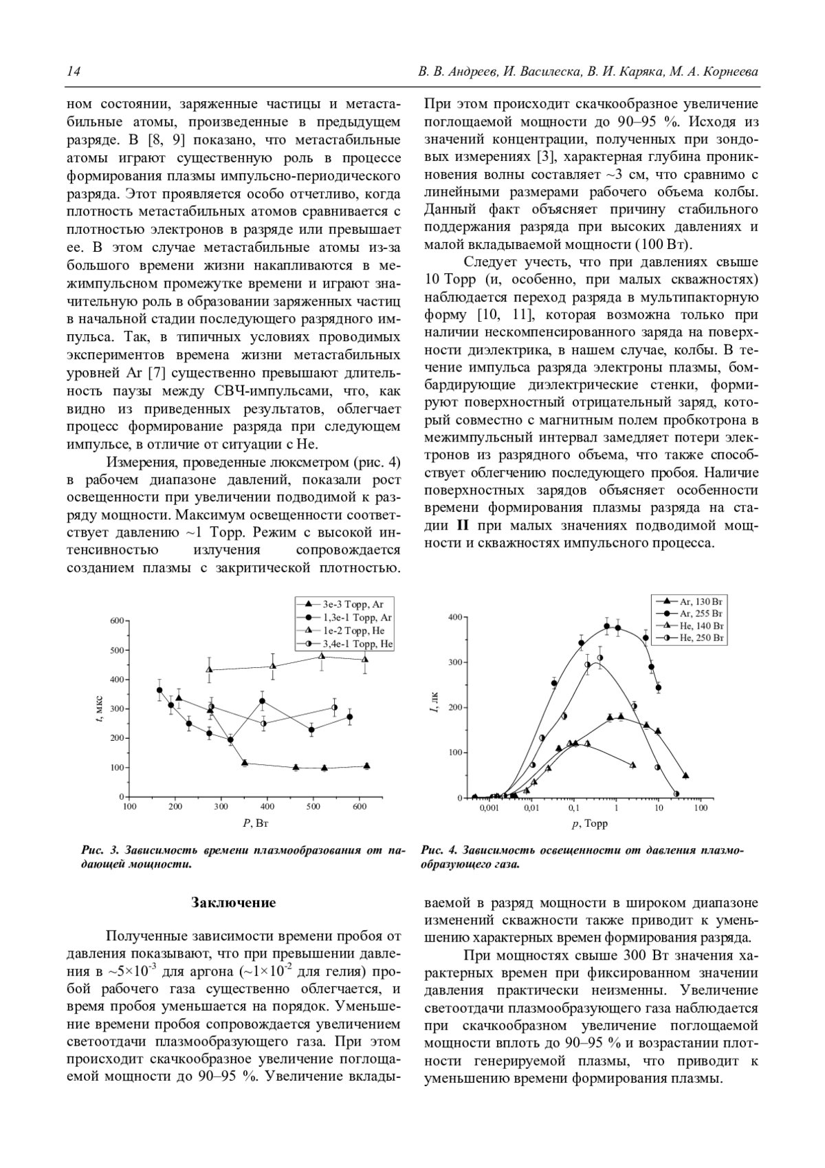 Андреев В. В., Василеска И., Каряка В. И., Корнеева М. А. Особенности формирования плазмы импульсно-периодического резонансного СВЧ-разряда в инертных газах (Ar, He) при пониженном давлении 11