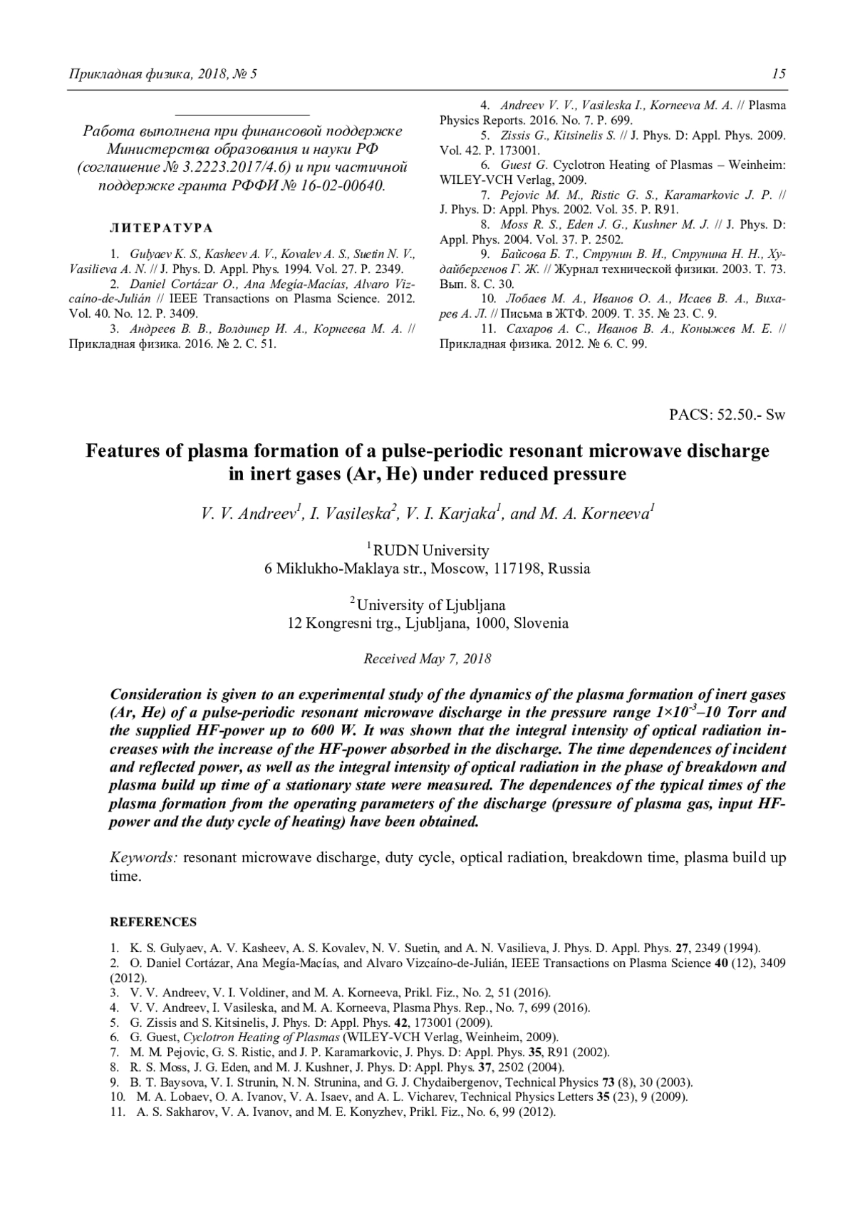 4. Andreev V. V., Vasileska I., Korneeva M. A. // Plasma Physics Reports. 2016. No. 7. P. 699.