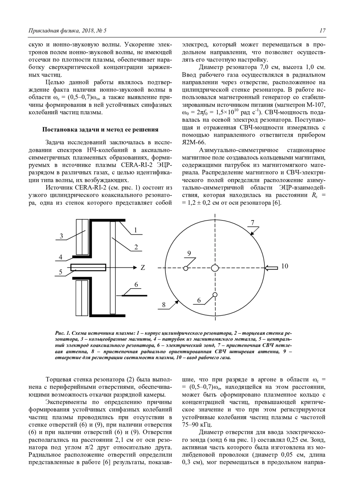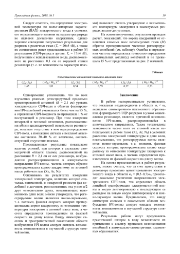 На основе представленных в работе результатов, можно считать, что за счет присутствия в резонаторе продольно ориентированного электрического зонда в области ωс = (0,5–0,7)ωо происходит локальное увеличение напряженности электрического СВЧ-поля, что определяет область линейной трансформации электромагнитной волны в косую ленгмюровскую с последующим ее распадом на новую косую ленгмюровскую и ионно-звуковую волны. Предполагаем, что ввиду симметрии системы и локальности области возбуждения НЧ-волны следует ожидать возможность возникновения в изучаемой структуре стоячей волны.