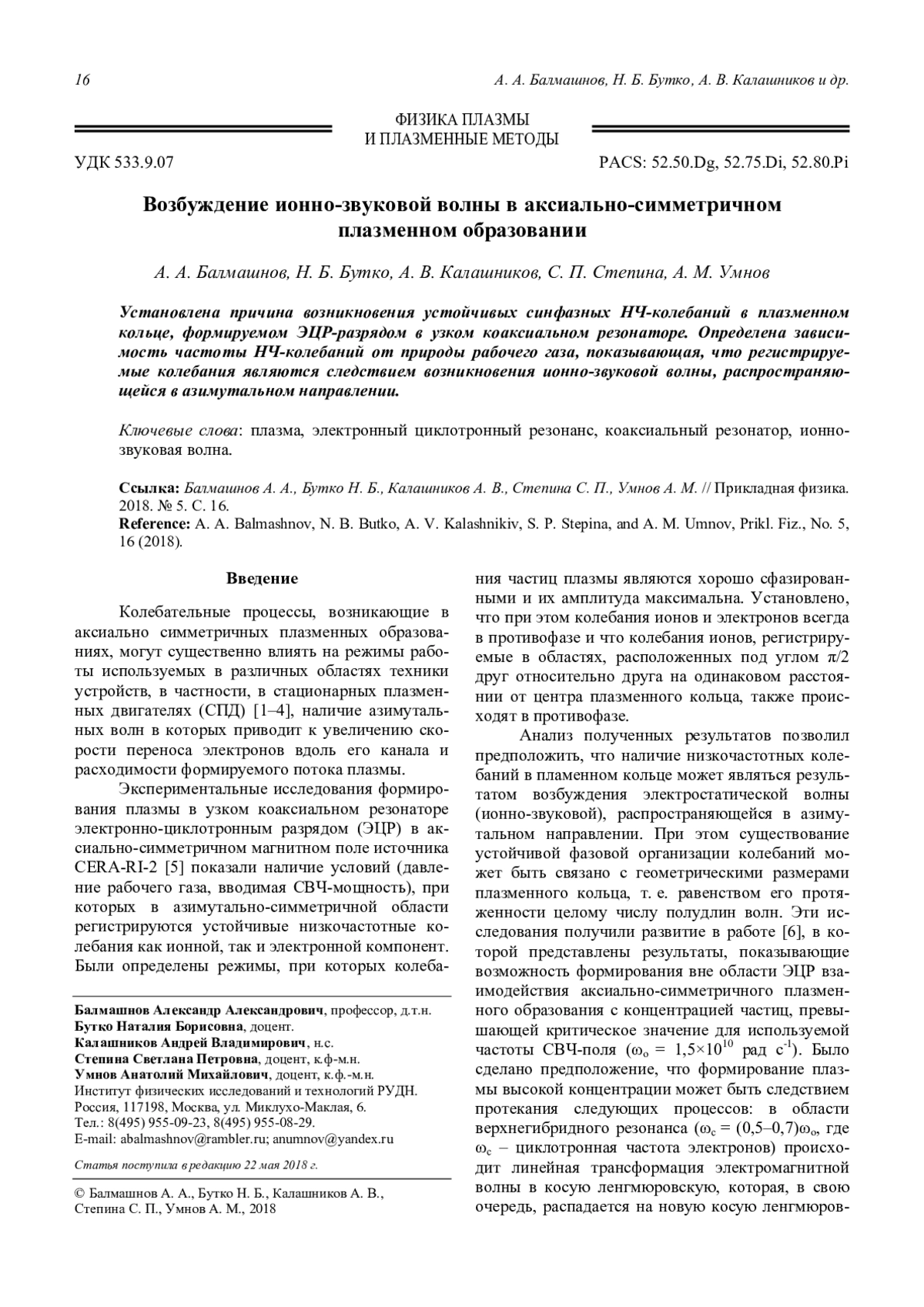 Балмашнов А. А., Бутко Н. Б., Калашников А. В., Степина С. П., Умнов А. М. Возбуждение ионно-звуковой волны в аксиально-симметричном плазменном образовании 16