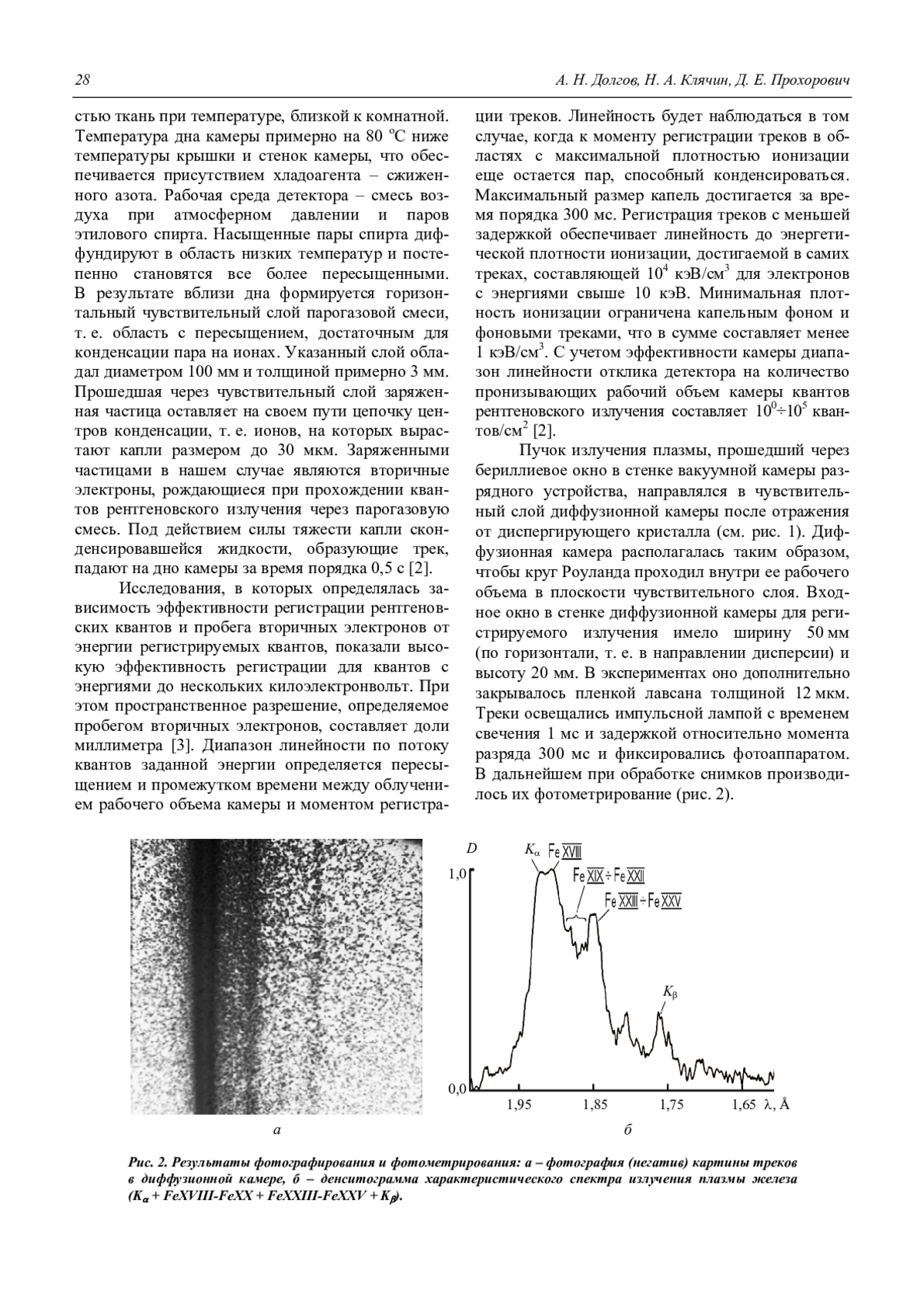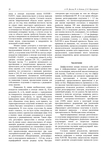 Продемонстрирована высокая эффективность диффузионной камеры в качестве детектора мягкого рентгеновского излучения для исследований импульсной высокотемпературной плазмы методами дифракционной спектроскопии высокого разрешения. В виде отдельных линий в спектре излучения низкоиндуктивной вакуумной искры удалось зарегистрировать характеристическое излучение K и K железа и излучение многозарядных ионов FeXVIII  FeXXV. Согласно полученным результатам, признаком перехода к радиационному сжатию микропинча является появление в спектре излучения линии иона FeXVIII, что соответствует представлениям модели радиационного сжатия. Получены свидетельства опережающего развития ускорительных процессов по отношению к процессу распада микропинча.