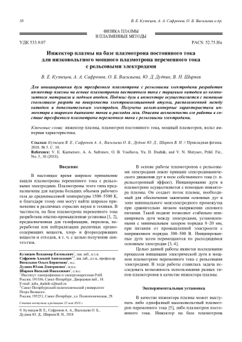 V. E. Kuznetsov, A. A. Safronov, O. B. Vasilieva, Yu. D. Dudnik, and V. N. Shiryaev Plasma injector based on a direct current plasma torch for low-voltage high-power alternating cur-rent plasma torch with rail electrodes 38