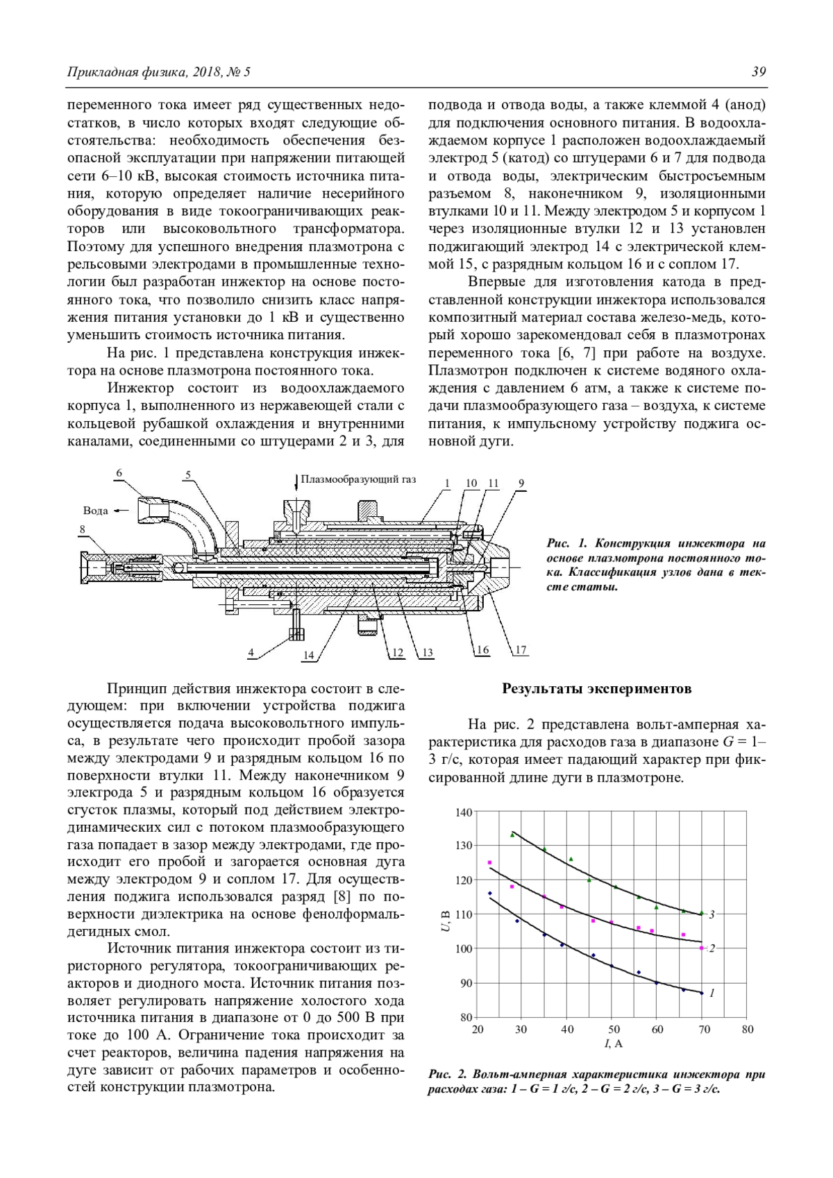 Для инициирования дуги трехфазного плазмотрона с рельсовыми электродами разработан инжектор плазмы на основе плазмотронов постоянного тока c торцевым катодом из композитного материала и медным анодом. Поджиг дуги в инжекторе осуществляется с помощью скользящего разряда на поверхности электроизоляционной втулки, расположенной между катодом и дополнительным электродом. Получены вольт-амперные характеристики инжектора в широком диапазоне токов и расходов газа. Описана возможность его работы в составе трехфазного плазмотрона переменного тока с рельсовыми электродами.