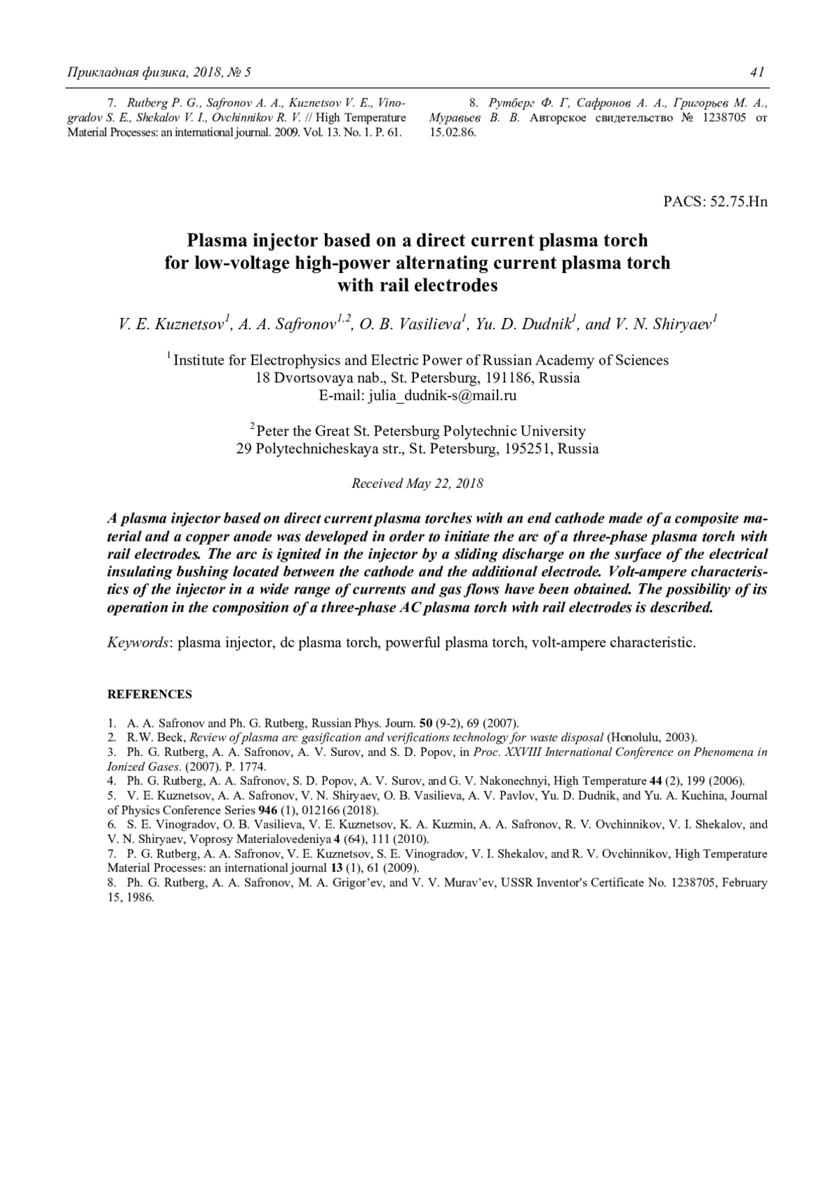 4. Rutberg Ph. G., Safronov A. A., Popov S. D., Surov A. V.,