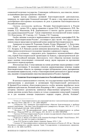 Целью является выявление роли Армянского человеколюбивого общества в благотворительной деятельности Российской империи для того, чтобы продемонстрировать интенсивность и продуктивность армяно-российских отношений в разные исторические эпохи. Научная новизна заключается в исследовании большого количества уникальных архивных документов, выявленных автором в Национальном архиве Армении. Методологической основой являются историко-генетический и сравнительно-исторический методы, которые позволили глубоко проанализировать процесс зарождения и развития благотворительности в Российской империи в целом и деятельность Армянского человеколюбивого общества в частности.
