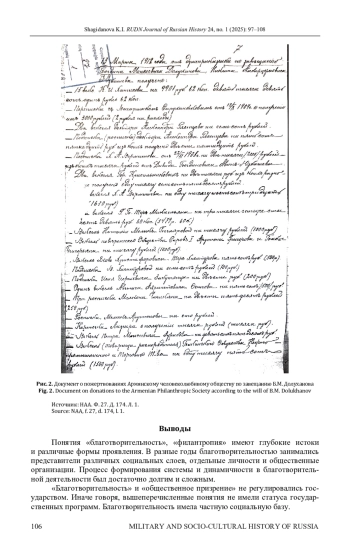 Результаты исследования указывают на значимую роль Армянского человеколюбивого общества в общественной жизни Закавказья, которую оно смогло занять благодаря неустанной поддержке армянского населения. Общество сыграло важную роль в укреплении армянской национальной идентичности. Автор приходит к выводу, что за годы своей деятельности общество сумело стать примером реализации благотворительной миссии. Новая тенденция в благотворительной сфере сложилась во второй половине XIX в., в эпоху реформ Александра II. Армянское человеколюбивое общество, определив принципиальные национальные приоритеты в реализации своей миссии, сумело благополучно вписаться в общероссийскую парадигму нравственных ценностей.