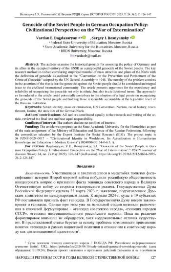 Рассматриваются исторические основания оценки политики Германии и ее союзников на оккупированной территории СССР в качестве геноцида советского народа. Ключевым методом исследования являлось соотнесение эмпирического материала массовых злодеяний и планов нацистов с определениями «Конвенции о предупреждении преступления геноцида и наказании за него», принятой резолюцией Генеральной Ассамблеи ООН 1948 г. Новизна постановки проблемы состоит в утверждении тезиса о геноциде против советского народа как целостной цивилизационной общности. Приводятся аргументы целесообразности и достоверности утверждения о факте геноцида не только в этническом, но и цивилизационном ракурсах. Сформулированные в статье подходы могут внести потенциальный вклад в принятие положения о геноциде советского народа и ответственности за него на законодательном уровне Российской Федерации.