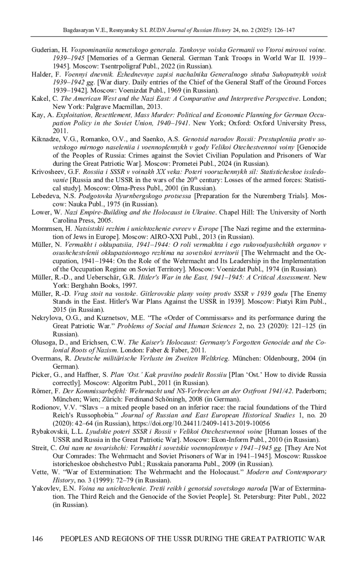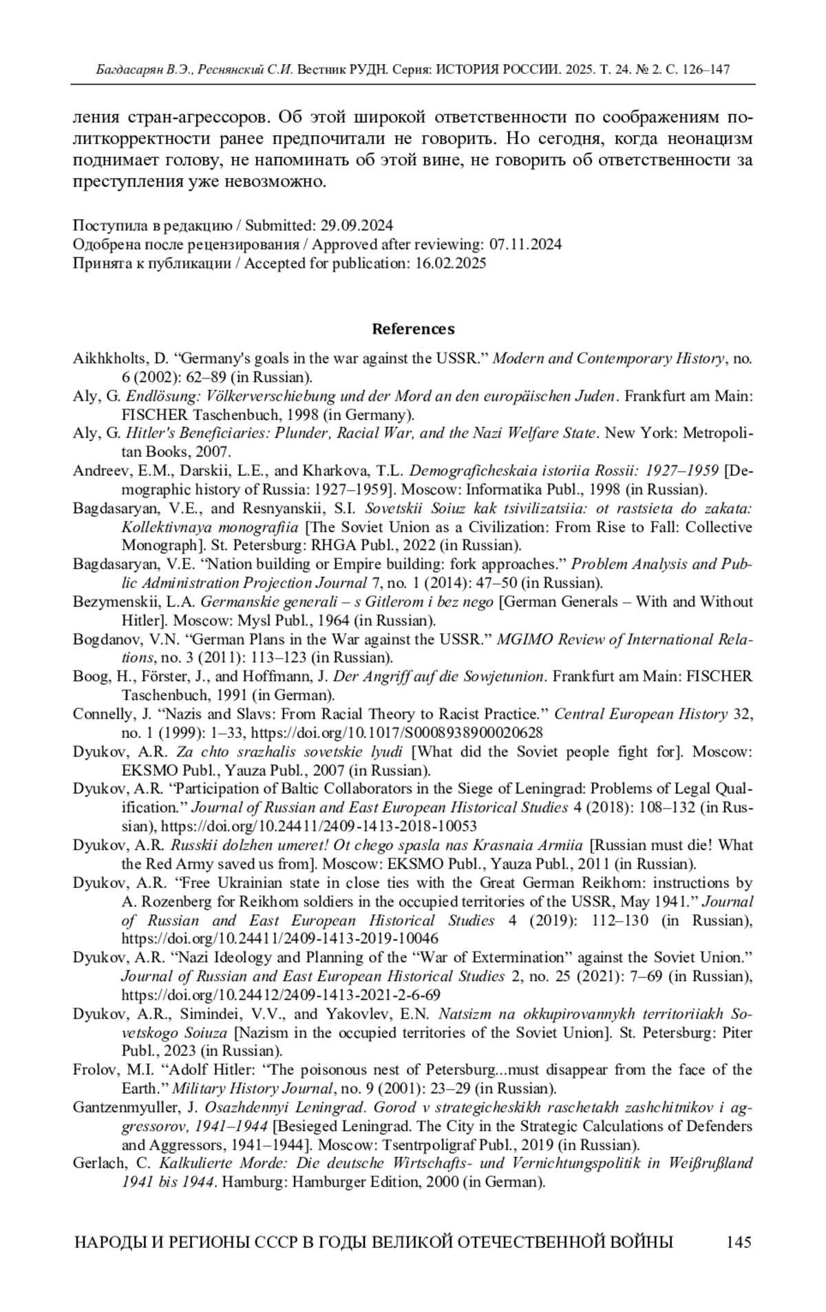 15. Дюков А.Р. Нацистская идеология и планирование “Войны на уничтожение” против Советского Союза // Журнал российских и восточноевропейских исторических исследований. 2021. № 2. С. 7-69. DOI: 10.24412/2409-1413-2021-2-6-69 EDN: RRIRND