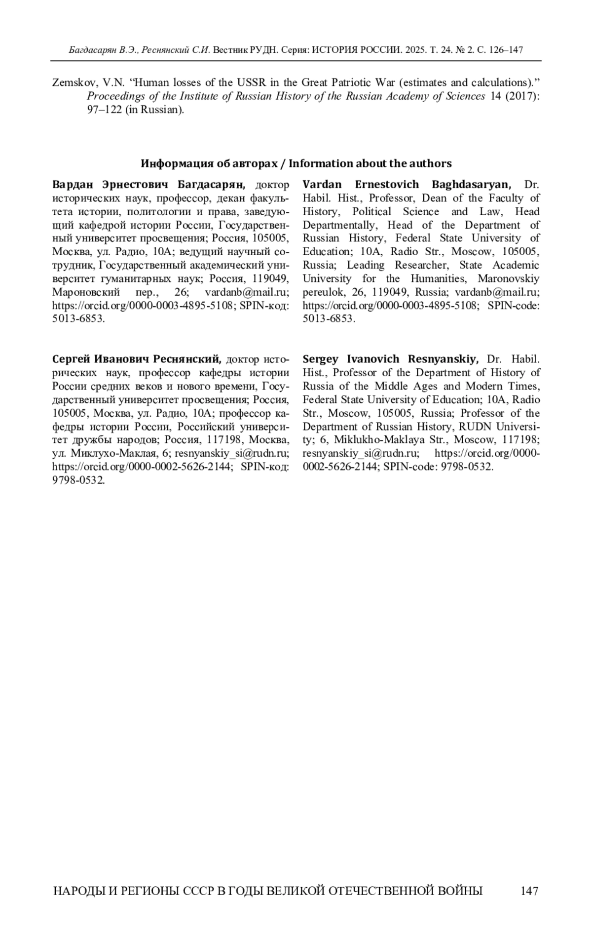 17. Земсков В.Н. Людские потери СССР в 1941-1945 гг. (к вопросу о степени достоверности имеющихся подсчётов) // Труды Института российской истории РАН. 2017. С. 97-122. EDN: ZSVYSX