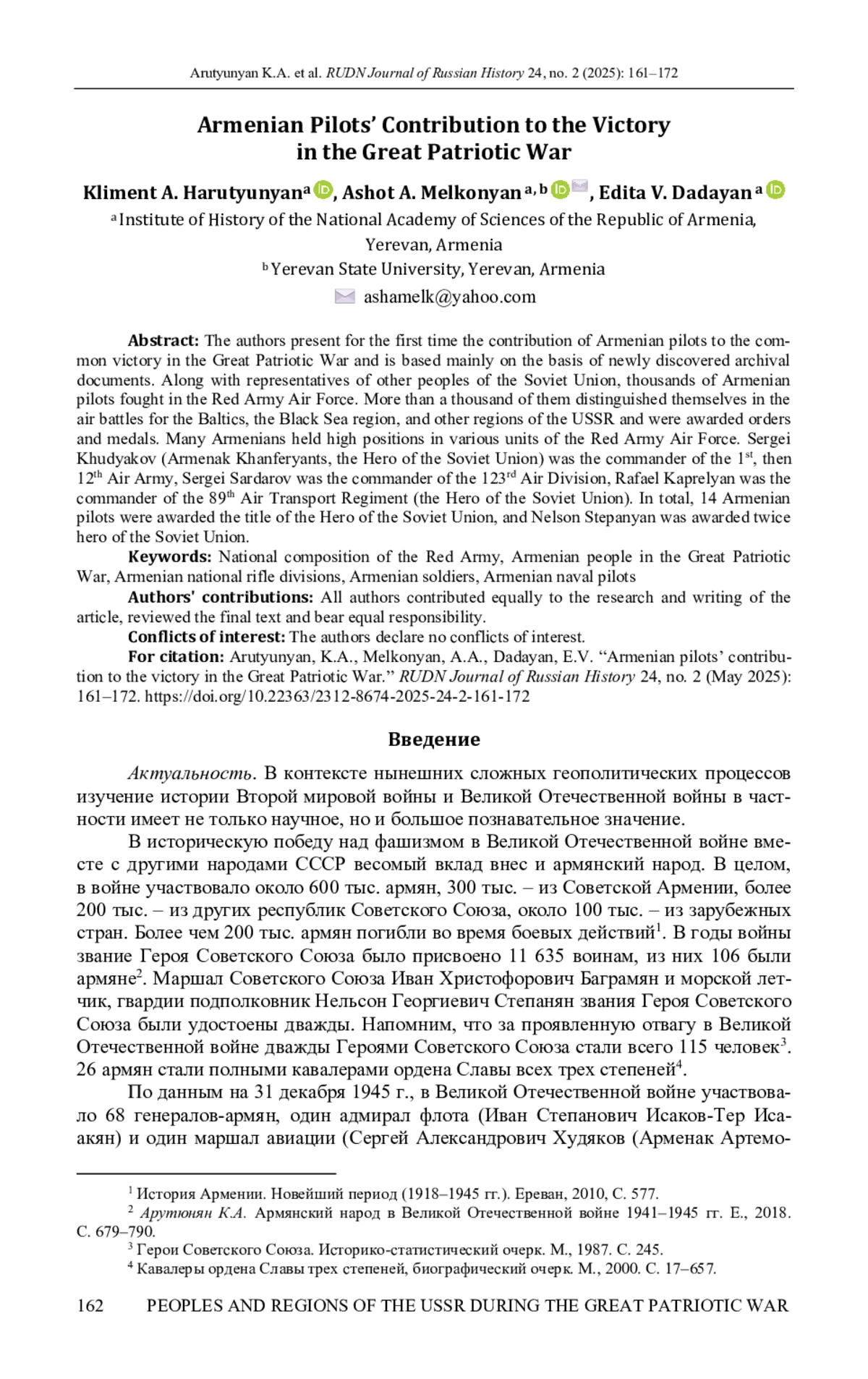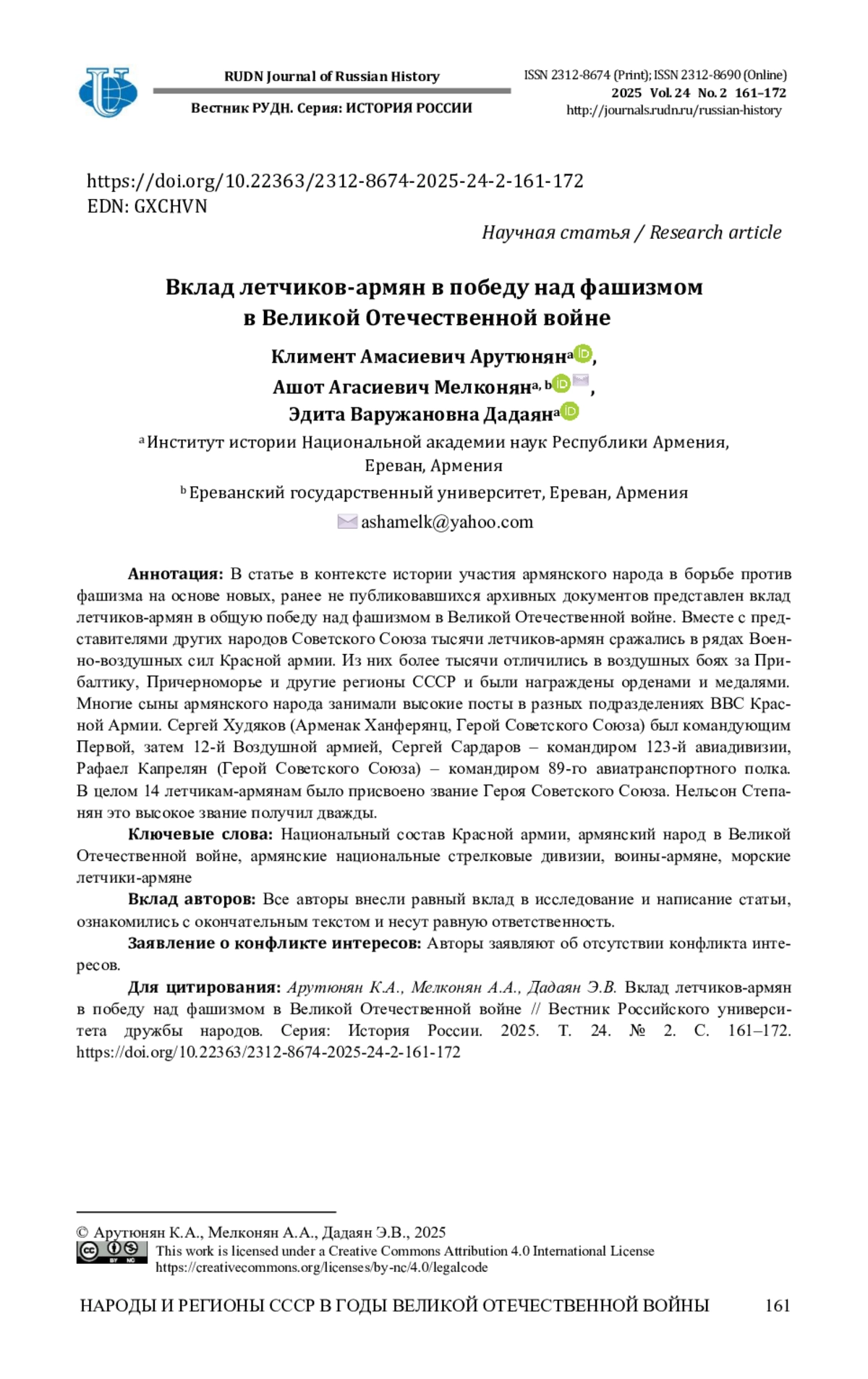 В статье в контексте истории участия армянского народа в борьбе против фашизма на основе новых, ранее не публиковавшихся архивных документов представлен вклад летчиков-армян в общую победу над фашизмом в Великой Отечественной войне. Вместе с представителями других народов Советского Союза тысячи летчиков-армян сражались в рядах Военно-воздушных сил Красной армии. Из них более тысячи отличились в воздушных боях за Прибалтику, Причерноморье и другие регионы СССР и были награждены орденами и медалями. Многие сыны армянского народа занимали высокие посты в разных подразделениях ВВС Красной Армии. Сергей Худяков (Арменак Ханферянц, Герой Советского Союза) был командующим Первой, затем 12-й Воздушной армией, Сергей Сардаров - командиром 123-й авиадивизии, Рафаел Капрелян (Герой Советского Союза) - командиром 89-го авиатранспортного полка. В целом 14 летчикам-армянам было присвоено звание Героя Советского Союза. Нельсон Степанян это высокое звание получил дважды.
