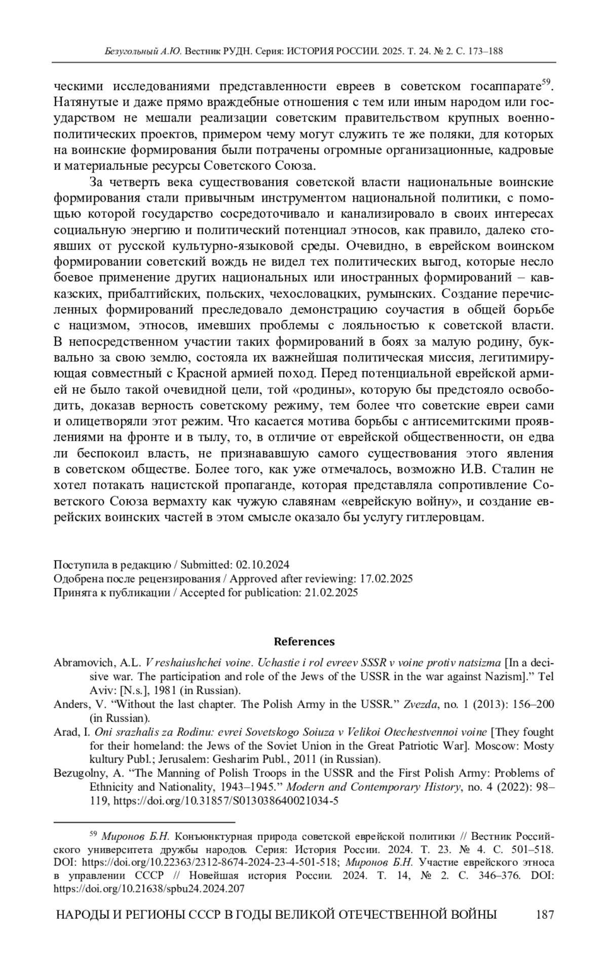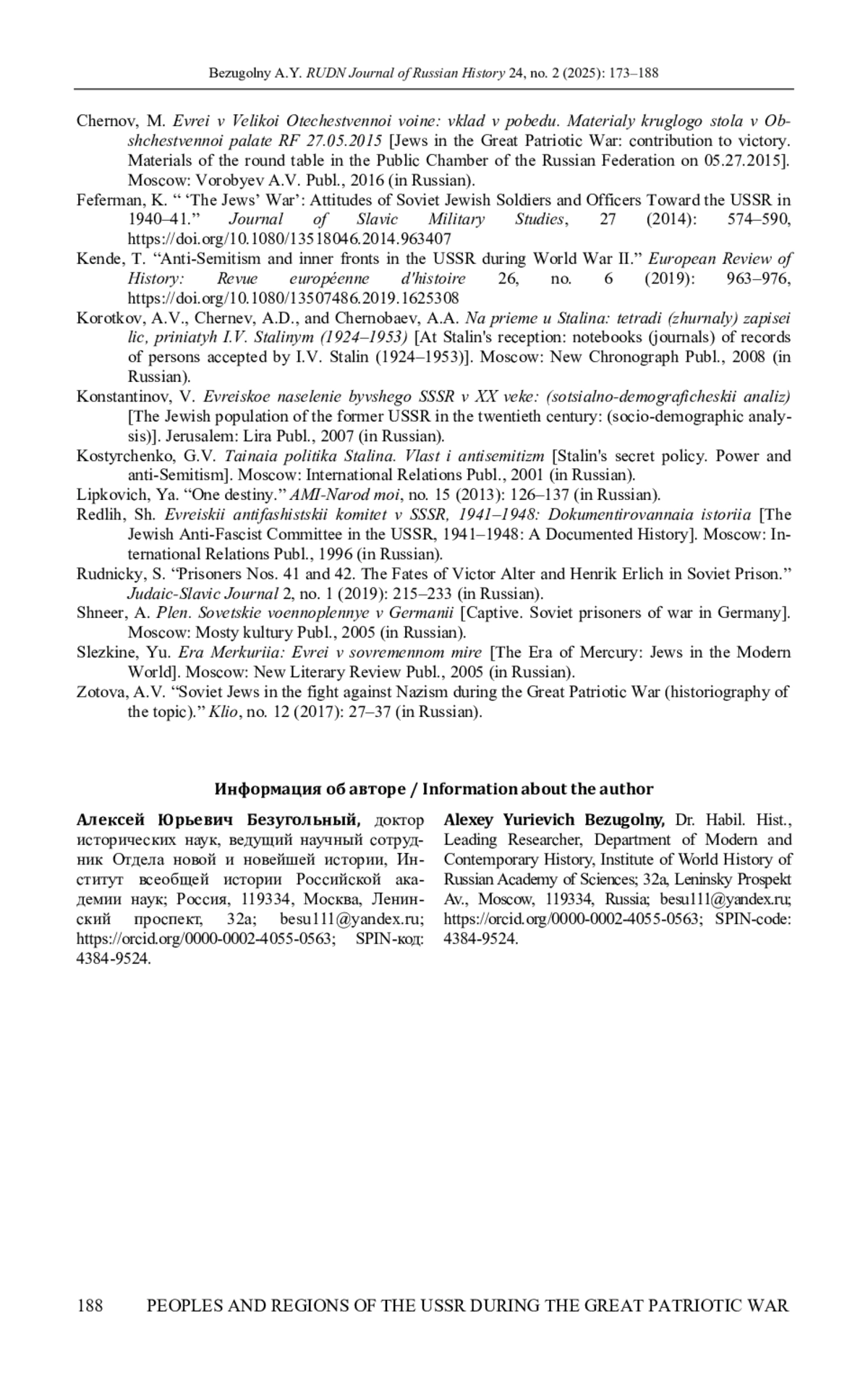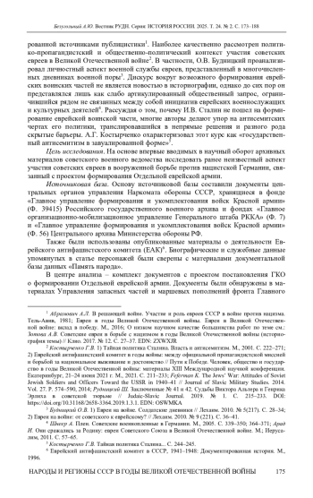 15. Feferman K. The Jews’ War: Attitudes of Soviet Jewish Soldiers and Officers Toward the USSR in 1940-41 // Journal of Slavic Military Studies. 2014. Vol. 27. P. 574-590. DOI: 10.1080/13518046.2014.963407 EDN: UFFXYH