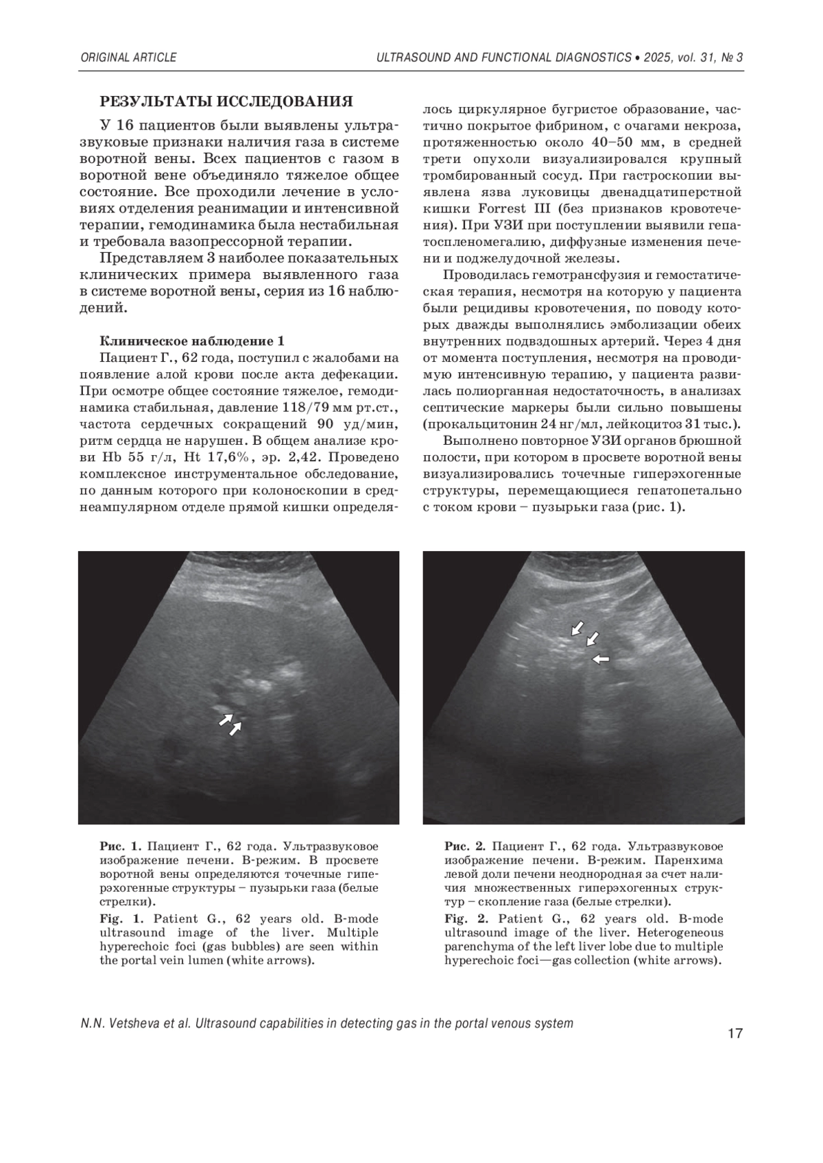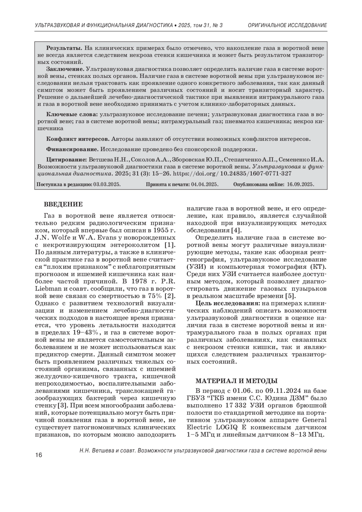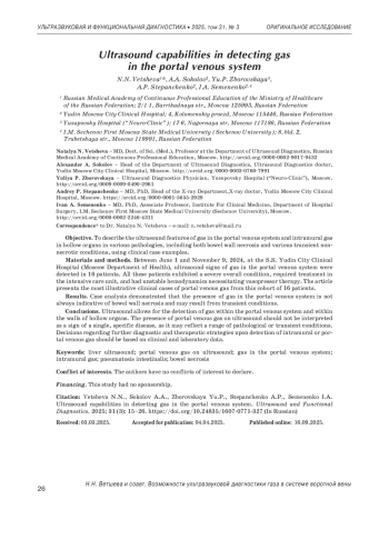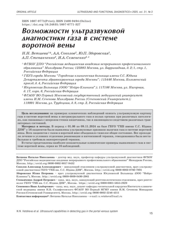 ВЕТШЕВА Н. Н., СОКОЛОВ А. А., ЗБОРОВСКАЯ Ю. П., СТЕПАНЧЕНКО А. П., СЕМЕНЕНКО И. А. ВОЗМОЖНОСТИ УЛЬТРАЗВУКОВОЙ ДИАГНОСТИКИ ГАЗА В СИСТЕМЕ ВОРОТНОЙ ВЕНЫ // УЛЬТРАЗВУКОВАЯ И ФУНКЦИОНАЛЬНАЯ ДИАГНОСТИКА. 2025. № 3, ТОМ 31
