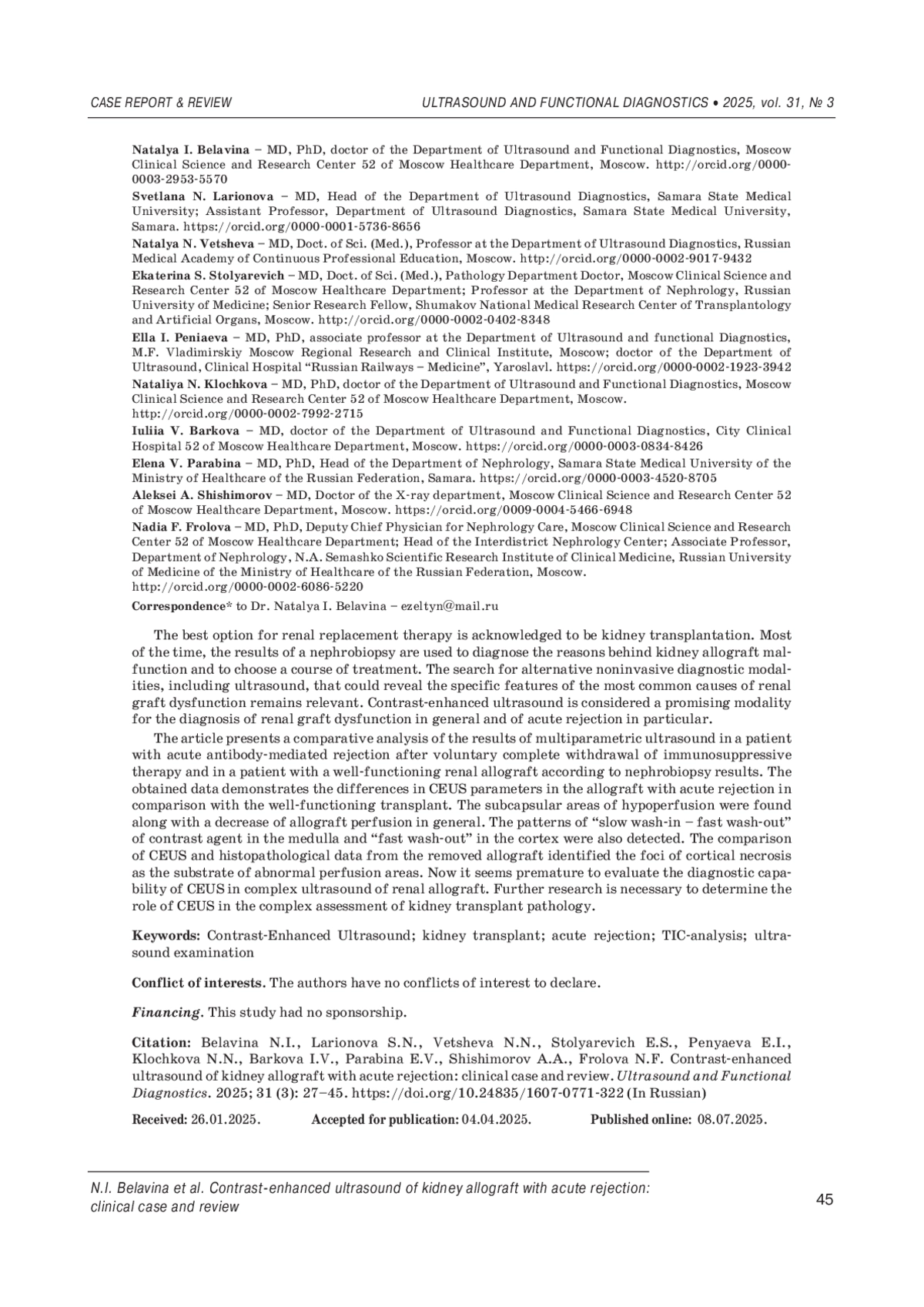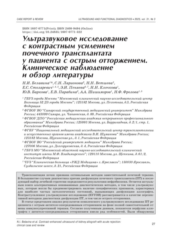18. Белавина Н.И., Трушкин Р.Н., Артюхина Л.Ю., Иванова Е.С., Столяревич Е.С., Манченко О.В., Исаев Т.К., Титов Д.А., Клочкова Н.Н., Лагойская Ю.А., Лысенко М.А. Роль ультразвукового исследования нефункционирующего почечного трансплантата в структуре обследования пациентов с синдромом непереносимости аллографта. Серия клинических наблюдений. Нефрология и диализ. 2023; 25 (3): 401-412. DOI: 10.28996/2618-9801-2023-3-401-412