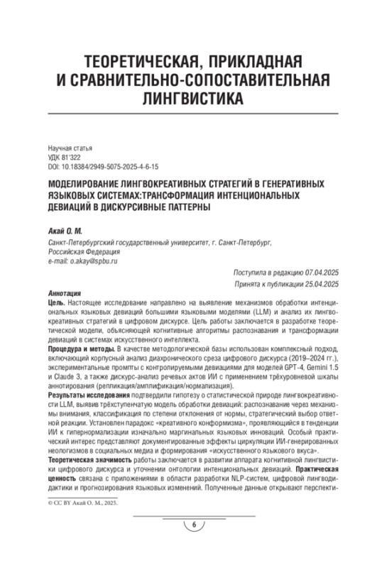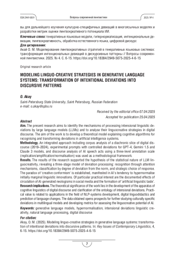 Цель. Настоящее исследование направлено на выявление механизмов обработки интенциональных языковых девиаций большими языковыми моделями (LLM) и анализ их лингво-креативных стратегий в цифровом дискурсе. Цель работы заключается в разработке теоретической модели, объясняющей когнитивные алгоритмы распознавания и трансформации девиаций в системах искусственного интеллекта.