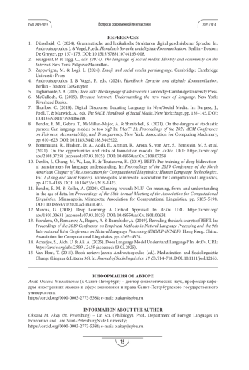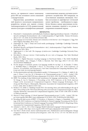 1. Dürscheid C. Grammatische und lexikalische Strukturen digital geschriebener Sprache // Handbuch Sprache und digitale Kommunikation / eds. J. Androutsopoulos, F. Vogel. Berllin - Boston: De Gruyter, 2024. P. 157-175. DOI: 10.1515/9783110744163-008