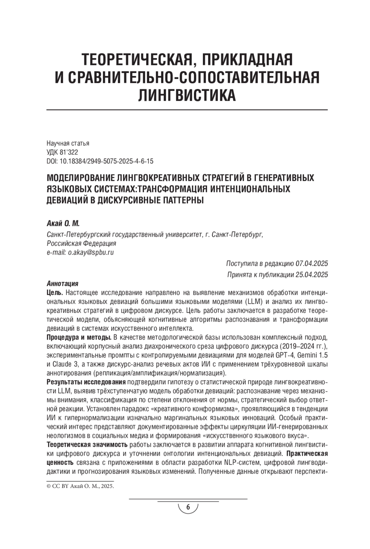 Процедура и методы. В качестве методологической базы использован комплексный подход, включающий корпусный анализ диахронического среза цифрового дискурса (2019-2024 гг.), экспериментальные промпты с контролируемыми девиациями для моделей GPT-4, Gemini 1.5 и Claude 3, а также дискурс-анализ речевых актов ИИ с применением трёхуровневой шкалы аннотирования (репликация/амплификация/нормализация).
