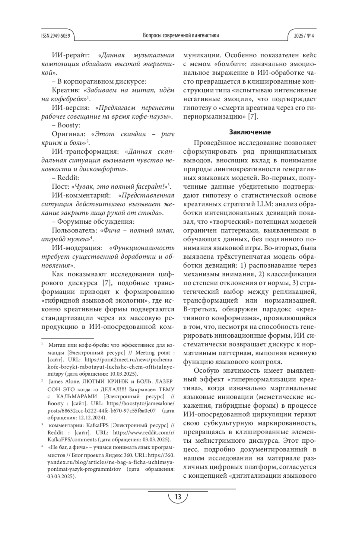 Теоретическая значимость работы заключается в развитии аппарата когнитивной лингвистики цифрового дискурса и уточнении онтологии интенциональных девиаций. Практическая ценность связана с приложениями в области разработки NLP-систем, цифровой лингводидактики и прогнозирования языковых изменений. Полученные данные открывают перспективы для дальнейшего изучения культурно-специфичных девиаций в многоязычных моделях и разработки метрик оценки лингвокреативного потенциала ИИ.