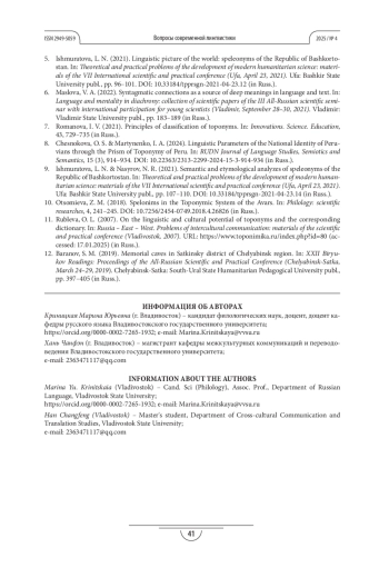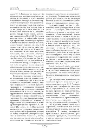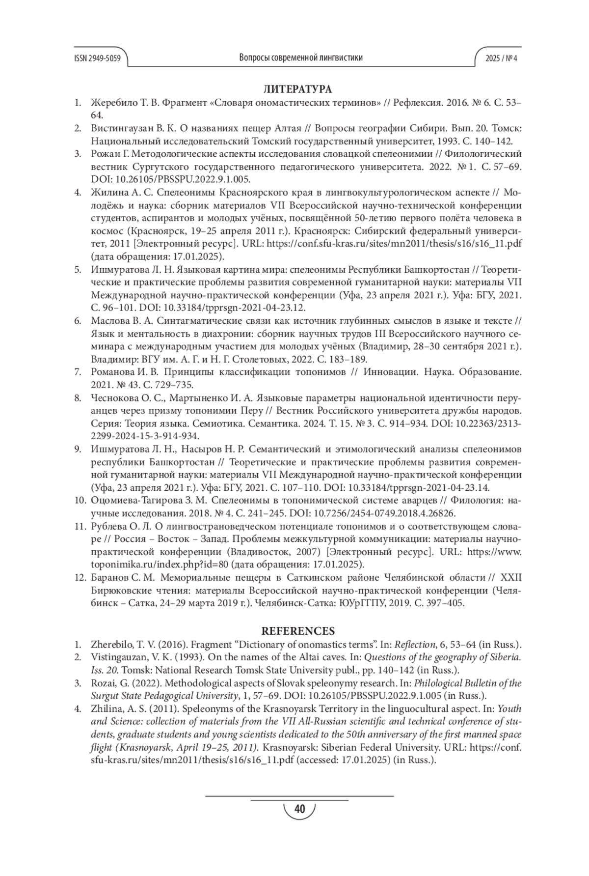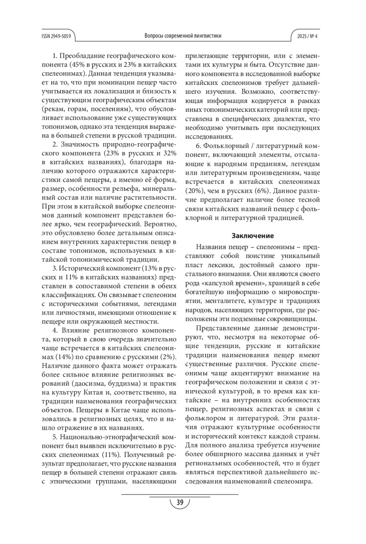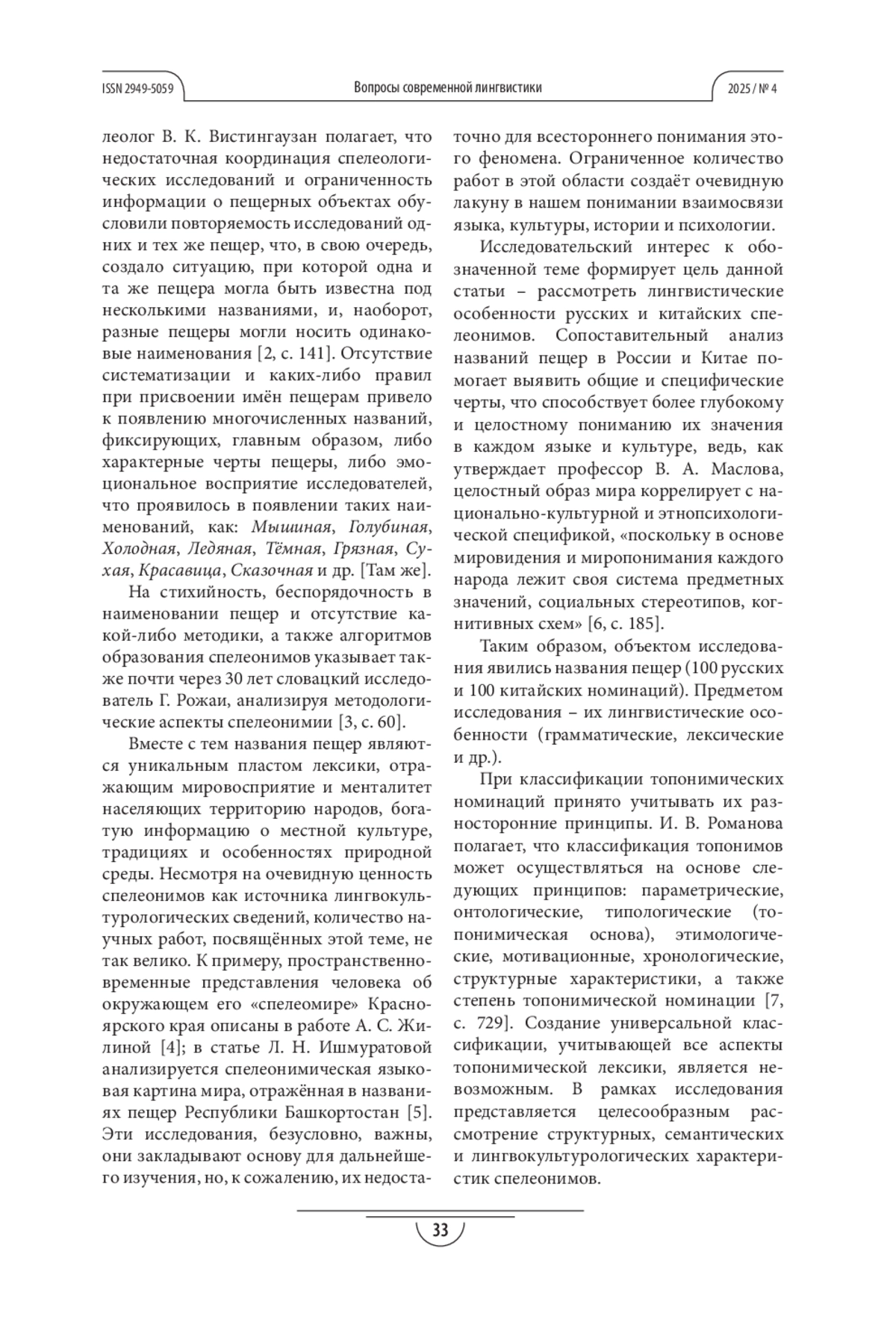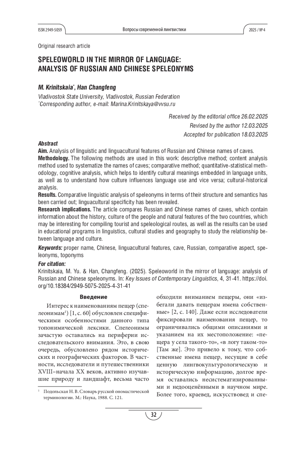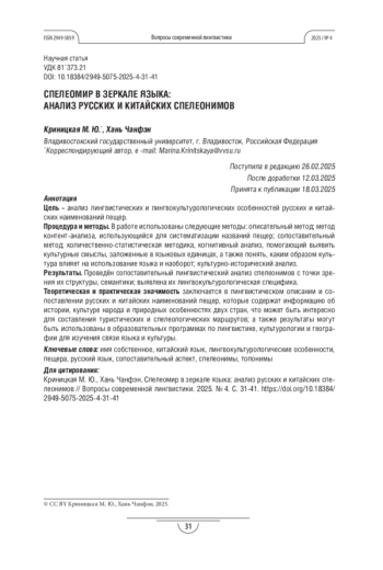 КРИНИЦКАЯ М. Ю., ХАНЬ Ч. СПЕЛЕОМИР В ЗЕРКАЛЕ ЯЗЫКА: АНАЛИЗ РУССКИХ И КИТАЙСКИХ СПЕЛЕОНИМОВ // ВОПРОСЫ СОВРЕМЕННОЙ ЛИНГВИСТИКИ. 2025. № 4