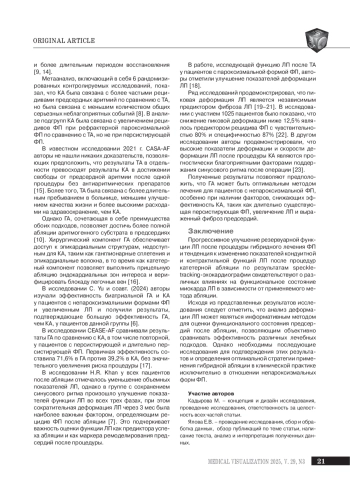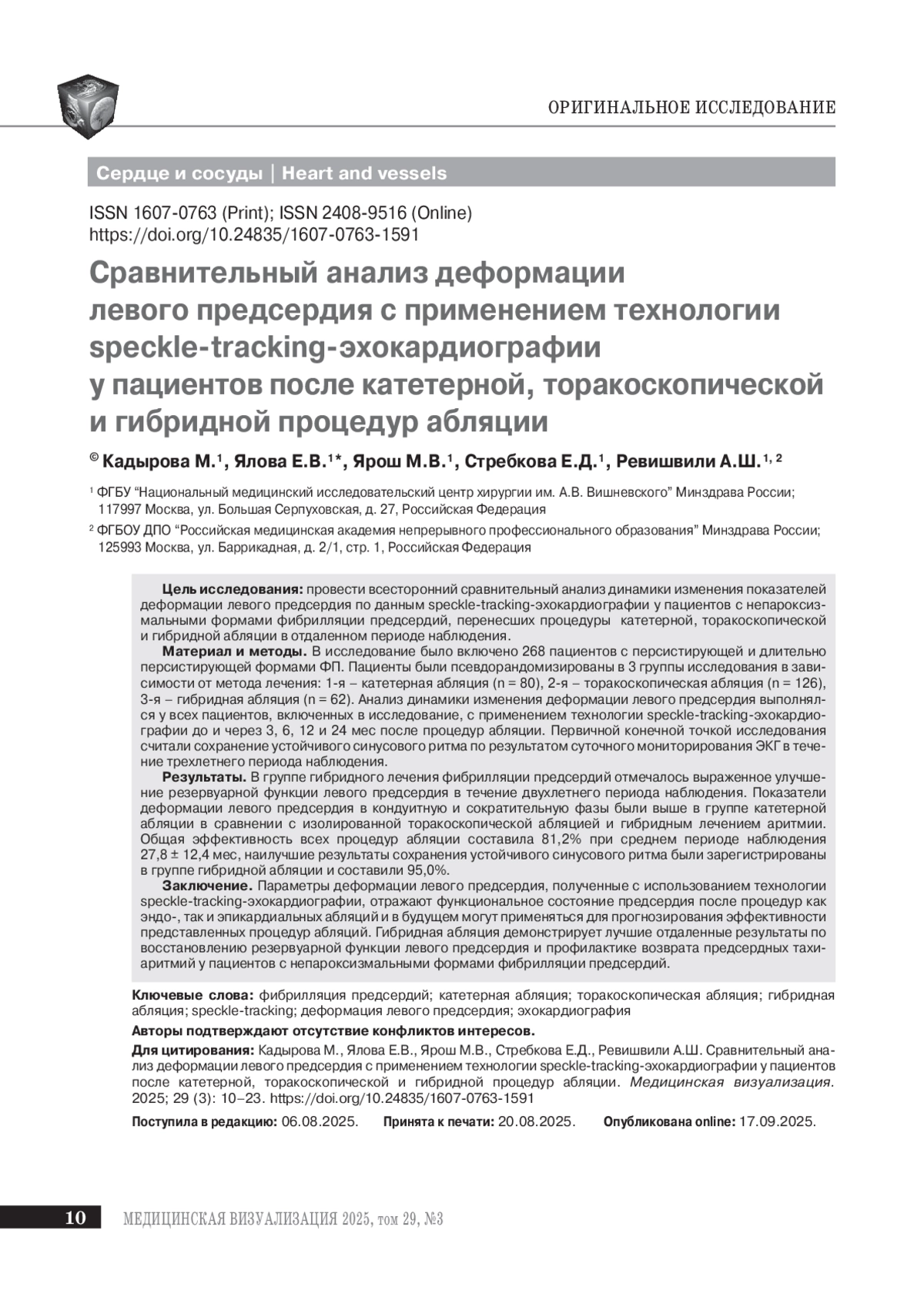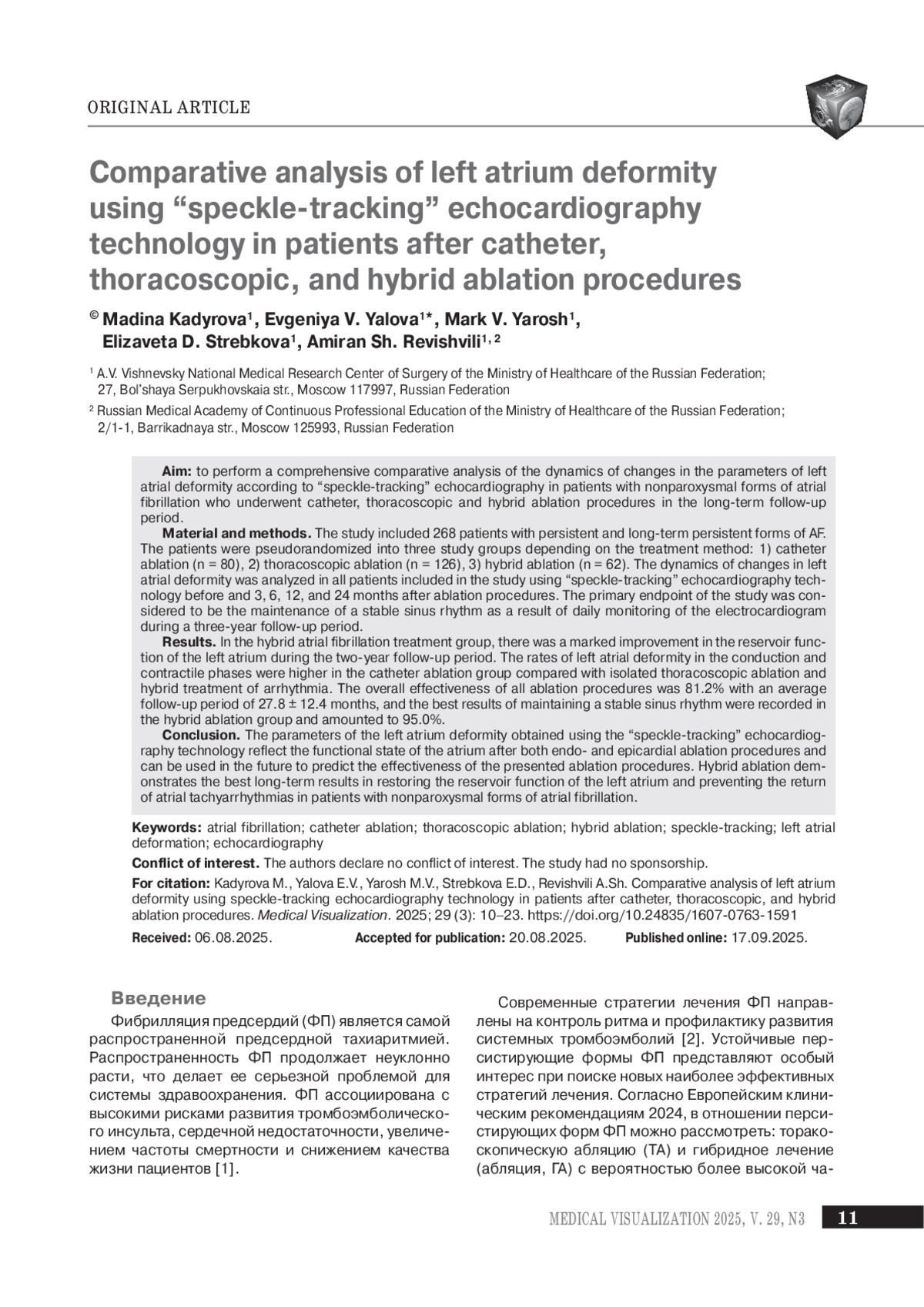 Заключение. Параметры деформации левого предсердия, полученные с использованием технологии speckle-tracking-эхокардиографии, отражают функциональное состояние предсердия после процедур как эндо-, так и эпикардиальных абляций и в будущем могут применяться для прогнозирования эффективности представленных процедур абляций. Гибридная абляция демонстрирует лучшие отдаленные результаты по восстановлению резервуарной функции левого предсердия и профилактике возврата предсердных тахиаритмий у пациентов с непароксизмальными формами фибрилляции предсердий.