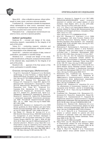 16. Baudo M., Petruccelli R.D., D’Alonzo M. et al. Rhythm outcomes of minimally-invasive off-pump surgical versus catheter ablation in atrial fibrillation: A meta-analysis of reconstructed time-to-event data.Int. J. Cardiol. 2023; 376: 62-75. DOI: 10.1016/j.ijcard.2023.02.008