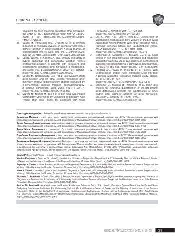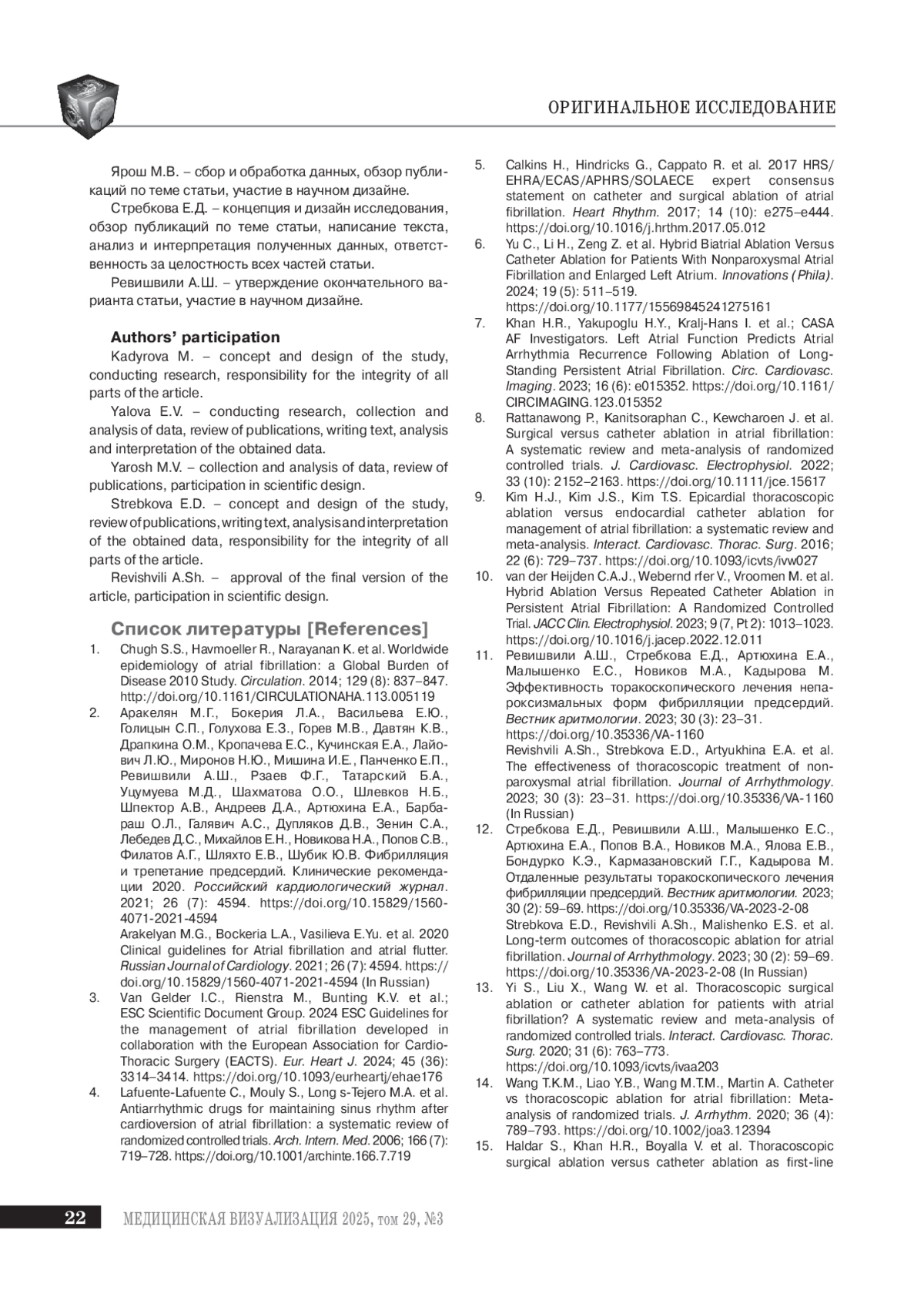 11. Ревишвили А.Ш., Стребкова Е.Д., Артюхина Е.А., Малышенко Е.С., Новиков М.А., Кадырова М. Эффективность торакоскопического лечения непароксизмальных форм фибрилляции предсердий. Вестникаритмологии. 2023; 30 (3): 23-31. DOI: 10.35336/VA-1160