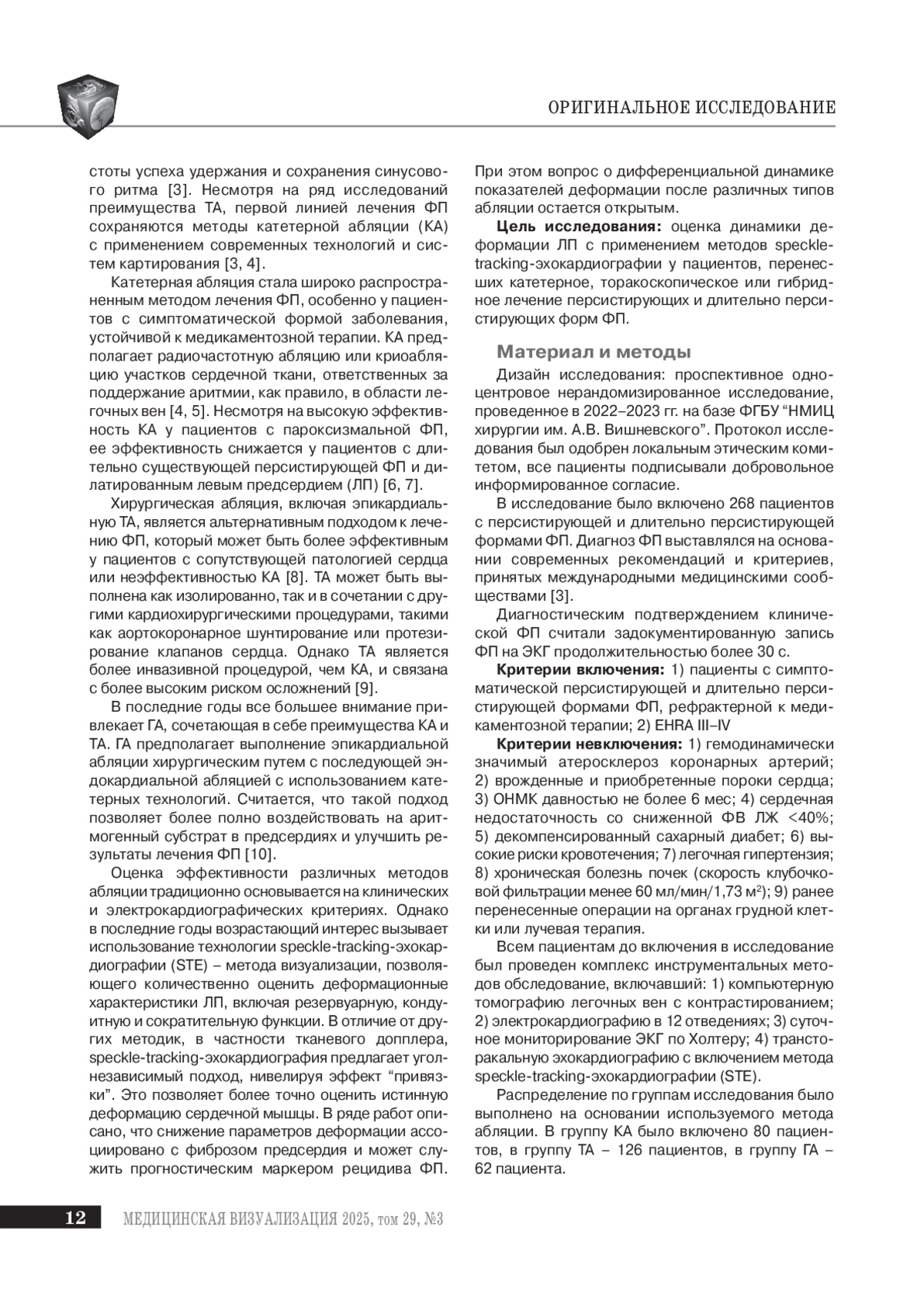 Материал и методы. В исследование было включено 268 пациентов с персистирующей и длительно персистирующей формами ФП. Пациенты были псевдорандомизированы в 3 группы исследования в зависимости от метода лечения: 1-я – катетерная абляция (n = 80), 2-я – торакоскопическая абляция (n = 126), 3-я – гибридная абляция (n = 62). Анализ динамики изменения деформации левого предсердия выполнялся у всех пациентов, включенных в исследование, с применением технологии speckle-tracking-эхокардиографии до и через 3, 6, 12 и 24 мес после процедур абляции. Первичной конечной точкой исследования считали сохранение устойчивого синусового ритма по результатом суточного мониторирования ЭКГ в течение трехлетнего периода наблюдения.