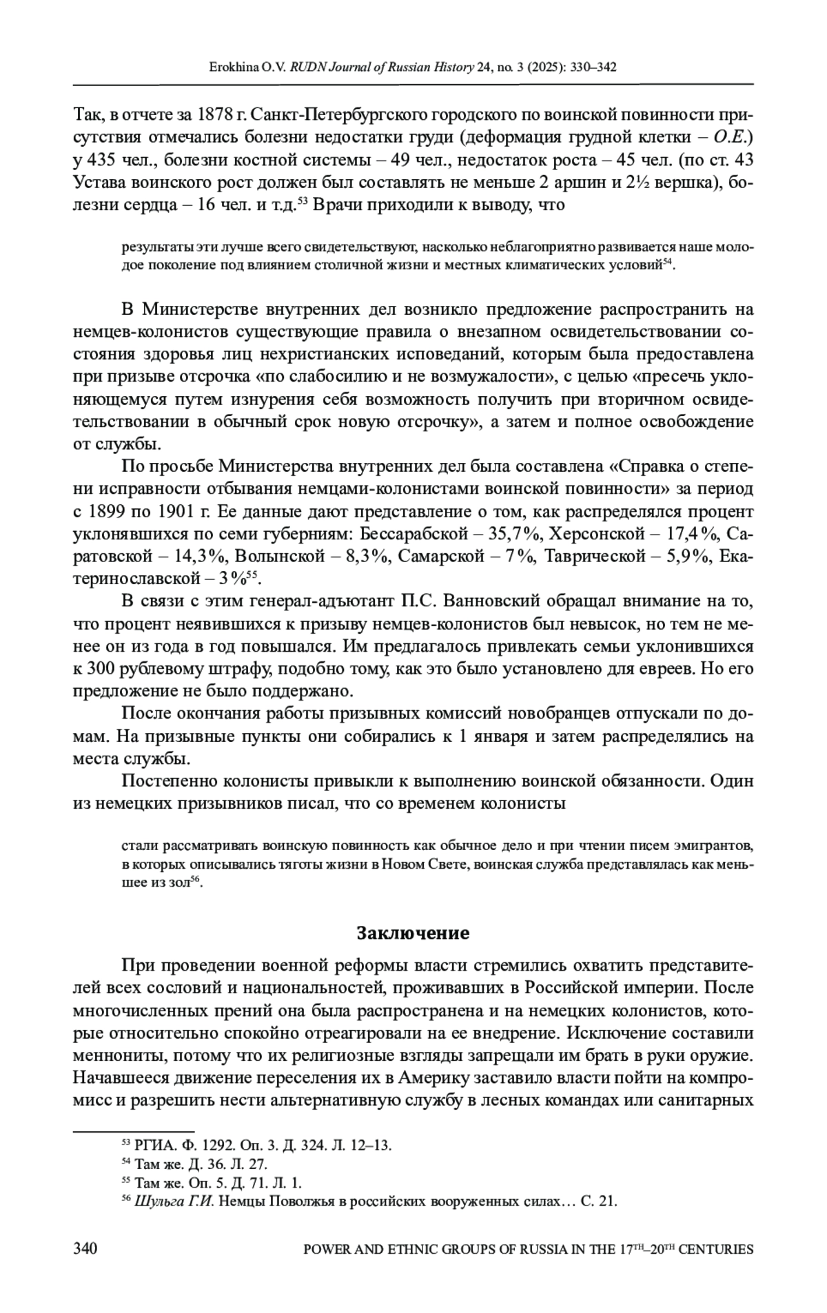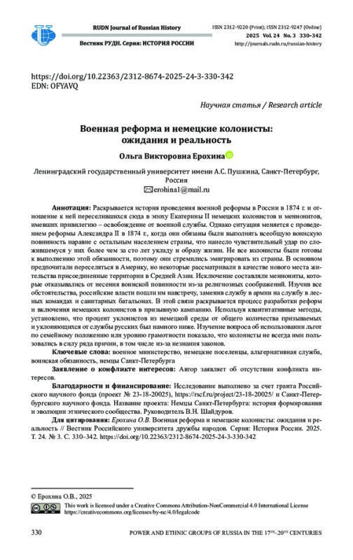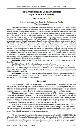 Раскрывается история проведения военной реформы в России в 1874 г. и отношение к ней переселившихся сюда в эпоху Екатерины II немецких колонистов и меннонитов, имевших привилегию - освобождение от военной службы. Однако ситуация меняется с проведением реформы Александра II в 1874 г., когда они обязаны были выполнять всеобщую воинскую повинность наравне с остальным населением страны, что нанесло чувствительный удар по сложившемуся у них более чем за сто лет укладу и образу жизни. Не все колонисты были готовы к выполнению этой обязанности, поэтому они стремились эмигрировать из страны. В основном предпочитали переселяться в Америку, но некоторые рассматривали в качестве нового места жительства присоединенные территории в Средней Азии. Исключение составляли меннониты, которые отказывались от несения воинской повинности из-за религиозных соображений. Изучив все обстоятельства, российские власти пошли им навстречу, заменив службу в армии на службу в лесных командах и санитарных батальонах. В этой связи раскрывается процесс разработки реформ и включения немецких колонистов в призывную кампанию. Используя квантитативные методы, установлено, что процент уклонистов из немецкой среды от общего количества призываемых и уклоняющихся от службы русских был намного ниже. Изучение вопроса об использовании льгот по семейному положению или уровню грамотности показало, что колонисты не всегда ими пользовались в силу ряда причин, в том числе из-за незнания законов.