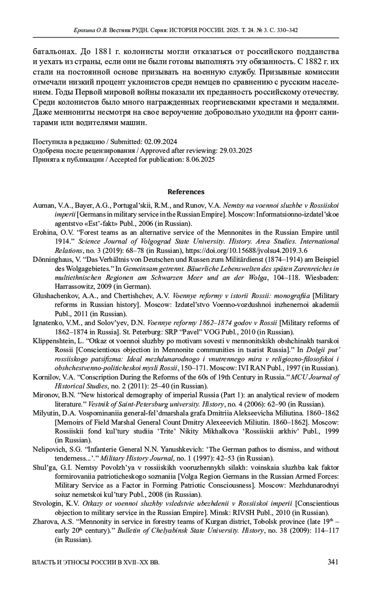 3. Ерохина О.В. Лесные команды - альтернативная служба меннонитов в Российской империи до 1914 года // Вестник Волгоградского государственного университета. Серия 4: История. Регионоведение. Международные отношения. 2019. № 3. Т. 24. С. 68-78. DOI: 10.15688/jvolsu4.2019.3.6 EDN: YAZSZU