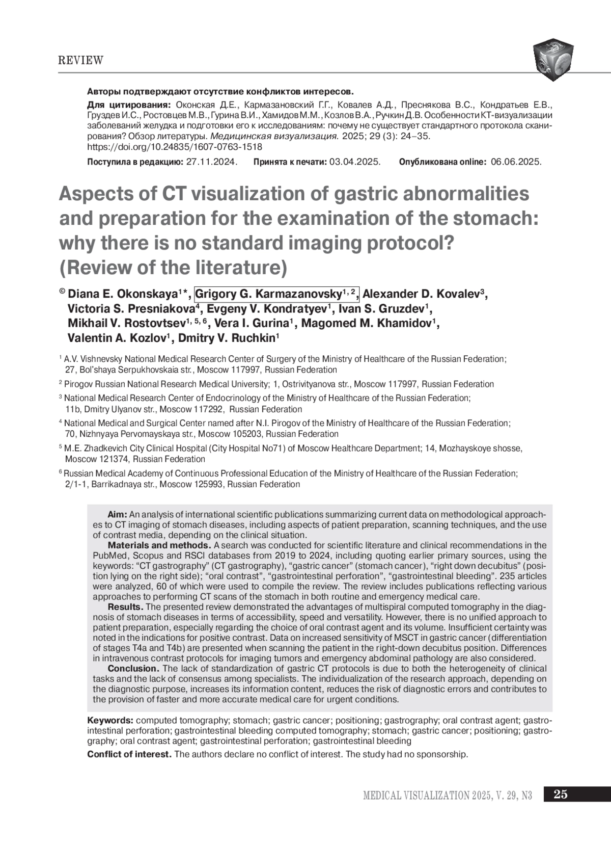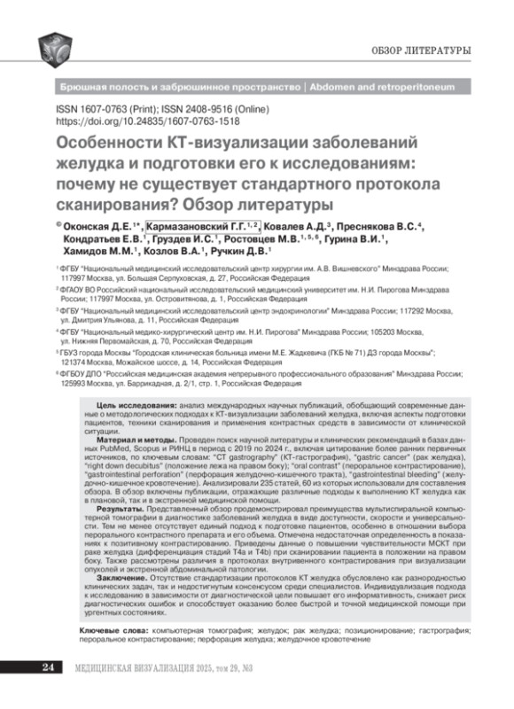 Заключение. Отсутствие стандартизации протоколов КТ желудка обусловлено как разнородностью клинических задач, так и недостигнутым консенсусом среди специалистов. Индивидуализация подхода к исследованию в зависимости от диагностической цели повышает его информативность, снижает риск диагностических ошибок и способствует оказанию более быстрой и точной медицинской помощи при ургентных состояниях.