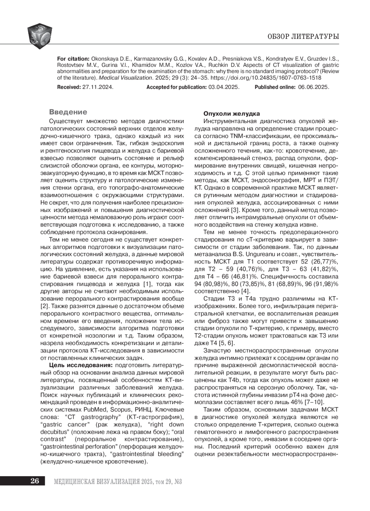 Материал и методы. Проведен поиск научной литературы и клинических рекомендаций в базах данных PubMed, Scopus и РИНЦ в период с 2019 по 2024 г., включая цитирование более ранних первичных источников, по ключевым словам: “CT gastrography” (КТ-гастрография), “gastric cancer” (рак желудка), “right down decubitus” (положение лежа на правом боку); “oral contrast” (пероральное контрастирование), “gastrointestinal perforation” (перфорация желудочно-кишечного тракта), “gastrointestinal bleeding” (желудочно-кишечное кровотечение). Анализировали 235 статей, 60 из которых использовали для составления обзора. В обзор включены публикации, отражающие различные подходы к выполнению КТ желудка как в плановой, так и в экстренной медицинской помощи.