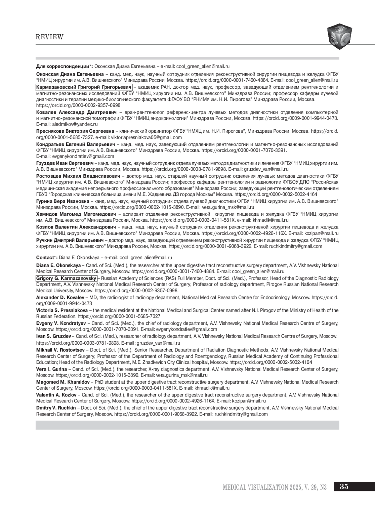 29. Захаренко А.А., Вовин К.Н., Беляев М.А., Трушин А.А., Купенская Т.В., Зайцев Д.А., Хамид А.Х., Палтышев И.А. Оптимизация хирургической тактики лечения больных раком желудка при вариантной анатомии целиакоме-зентериального бассейна. Вопросы онкологии. 2019; 65 (4): 537-545.