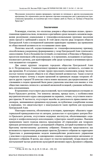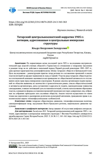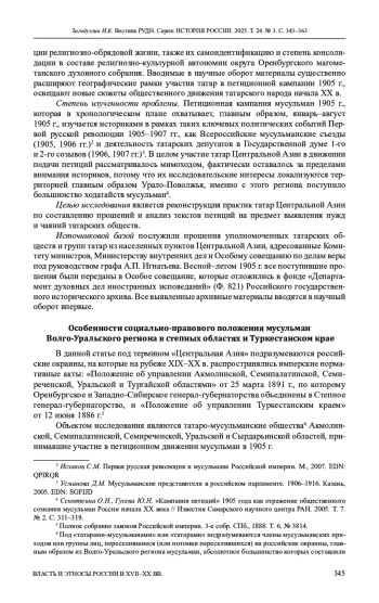 Цель исследования - реконструкция практик татар региона по составлению прошений и анализ текстов петиций на предмет выявления их нужд и чаяний. Участие ряда татарских обществ региона в петиционной кампании оценивается как проявление их общественной активности по отстаиванию своих прав перед имперскими структурами. В рамках анализа организации подачи прошений по областям выявлены их количество и хронологические рамки, список обществ/поселений и активисты организаторы, даты составления и адресаты их подачи, законодательные новшества самодержавия, ставшие мотивацией для составления петиций, степень использования образцовых текстов, освещаются формы составления прошений (группами или через доверенных лиц, избранных на собраниях приходских или сословных обществ). Анализ текстов осуществлен по таким темам как укрепление и расширение религиознокультурной автономии, гражданские права и дополнительная защита этноконфессиональных особенностей.