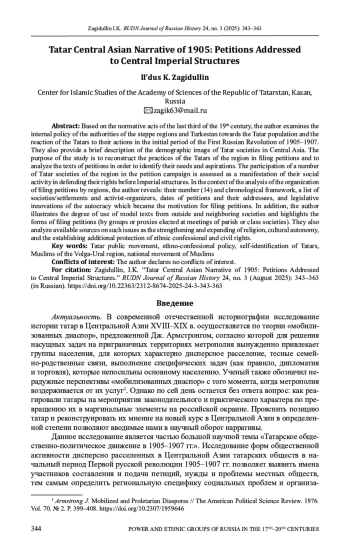 По нормативным актам последней трети XIX в. исследованы внутриполитический курс властей степных областей и Туркестана по отношению к татарскому населению и реакция татар на их действия в начальный период Первой русской революции 1905-1907 гг., дана краткая характеристика демографическому облику татарских обществ в Центральной Азии.