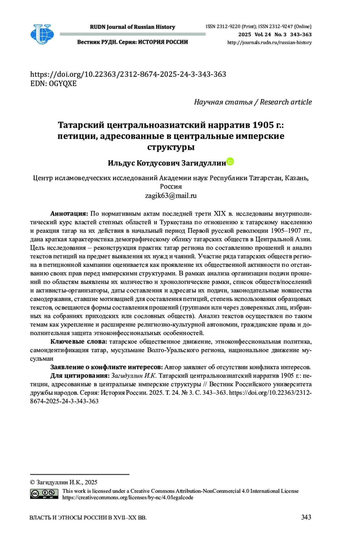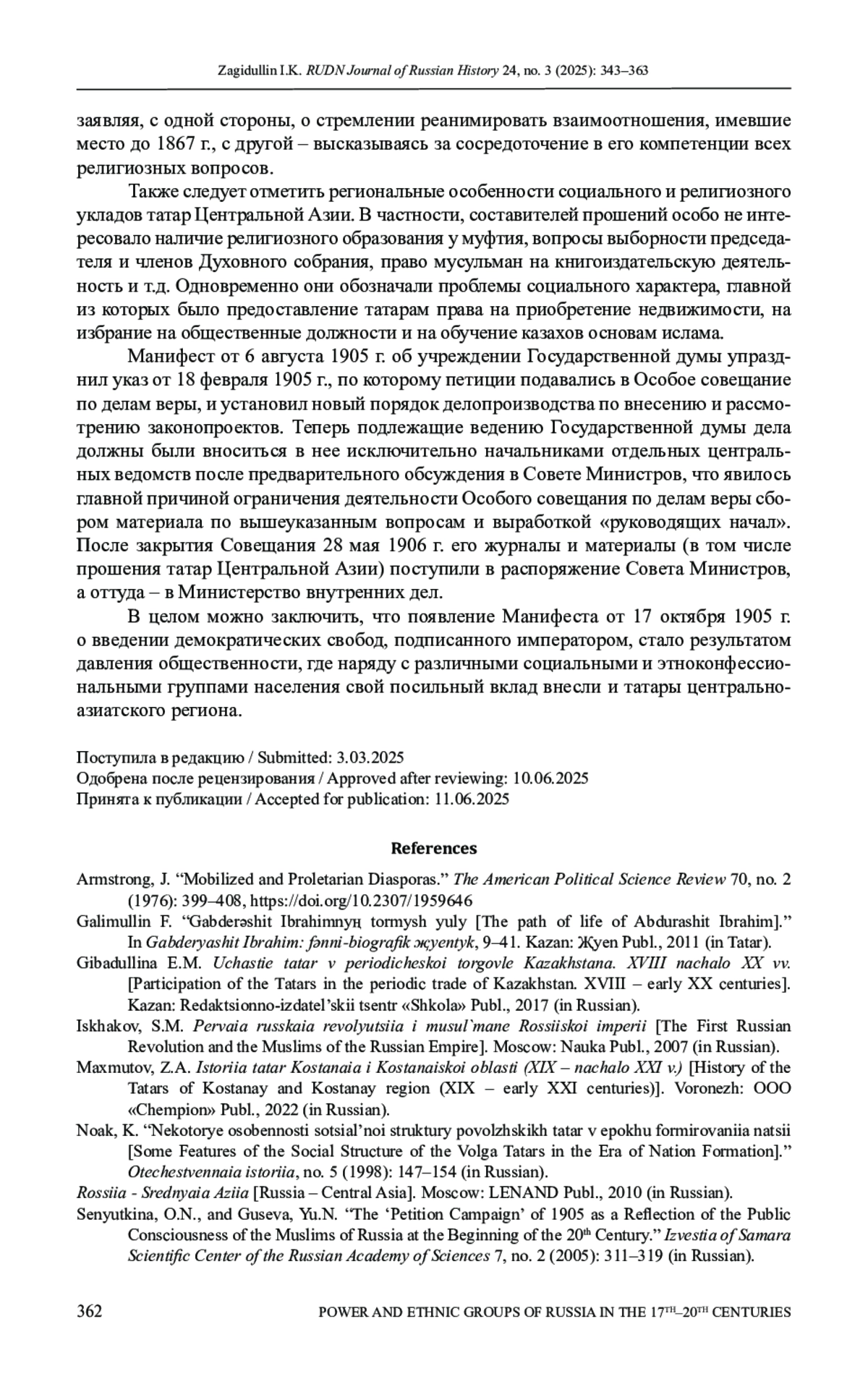 3. Загидуллин И.К. Татарское национальное движение в 1860-1905 гг.: монография. Казань: Татарское книжное издательство, 2014. 421 с. EDN: XMEPLN
