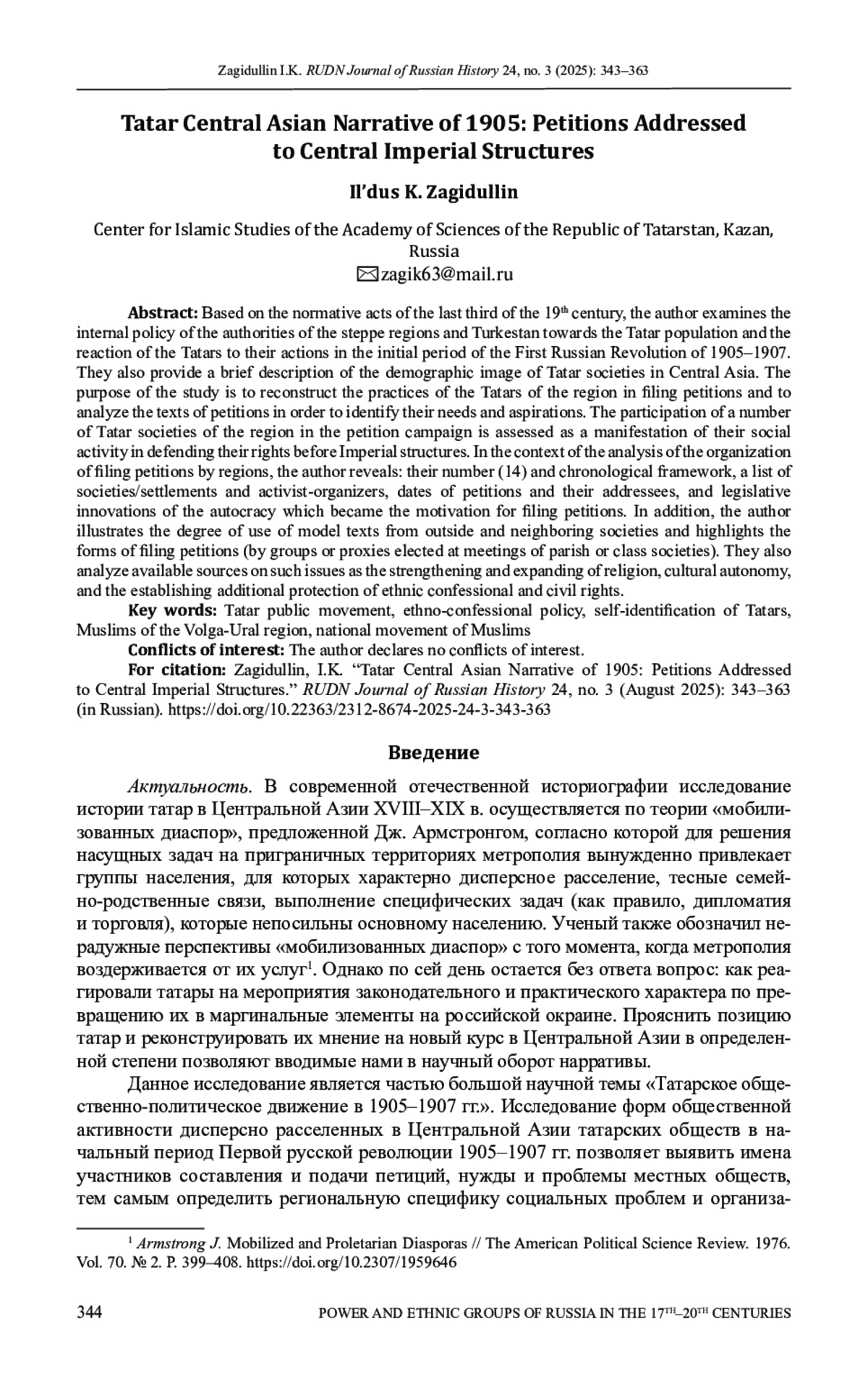 13. Armstrong J. Mobilized and Proletarian Diasporas // The American Political Science Review. 1976. Vol. 70. № 2. P. 399-408. DOI: 10.2307/1959646
