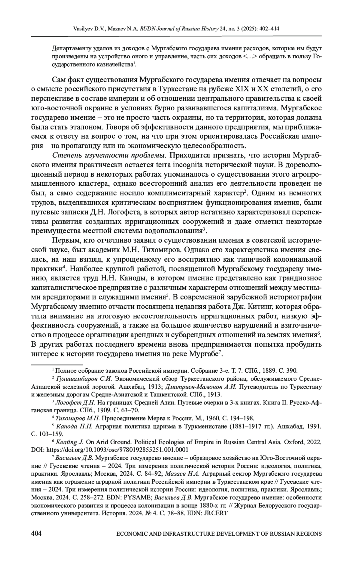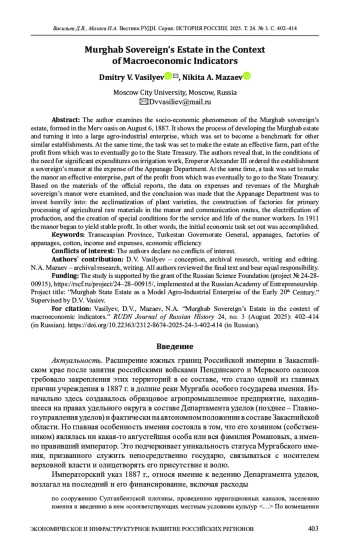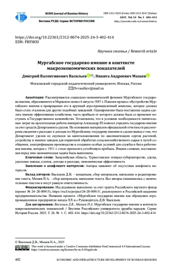 1. Васильев Д.В. Мургабское государево имение - образцовое хозяйство на Юго-Восточной окраине // Гусевские чтения - 2024. Три измерения политической истории России: идеология, политика, практики. Ярославль; М.: Канцлер, 2024. С. 84-92. EDN: BIGMXD