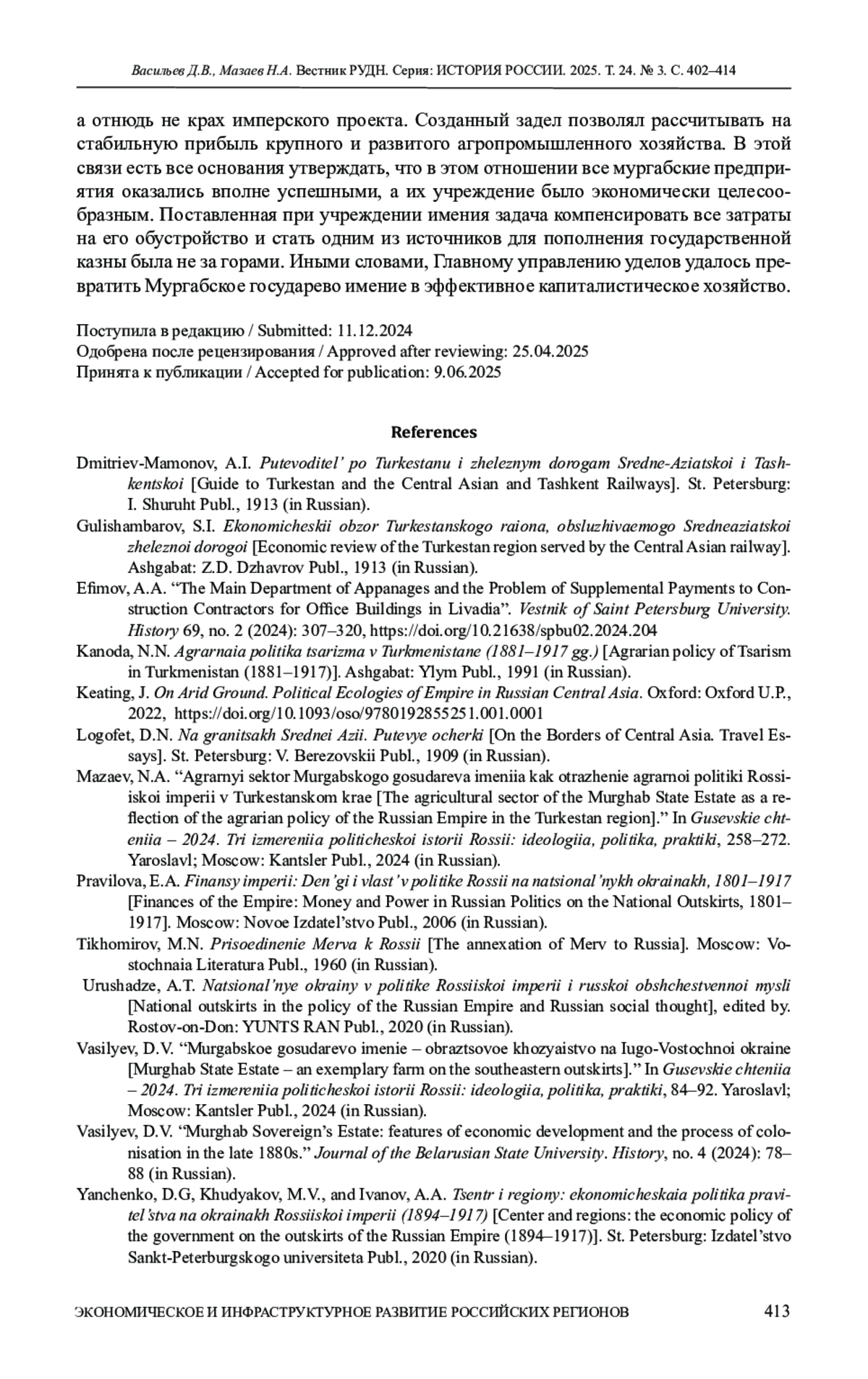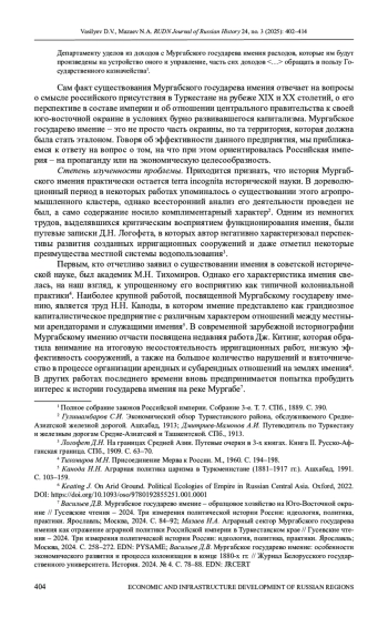 2. Васильев Д.В. Мургабское государево имение: особенности экономического развития и процесса колонизации в конце 1880-х гг. // Журнал Белорусского государственного университета. История. 2024. № 4. С. 78-88. EDN: JRCERT