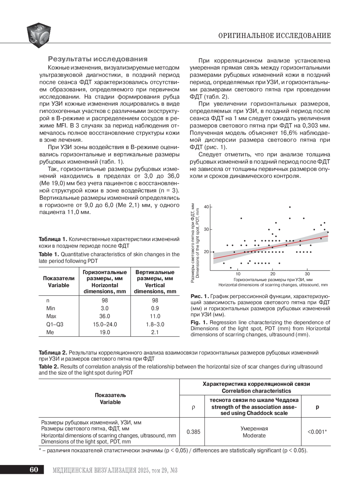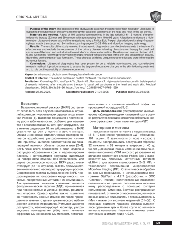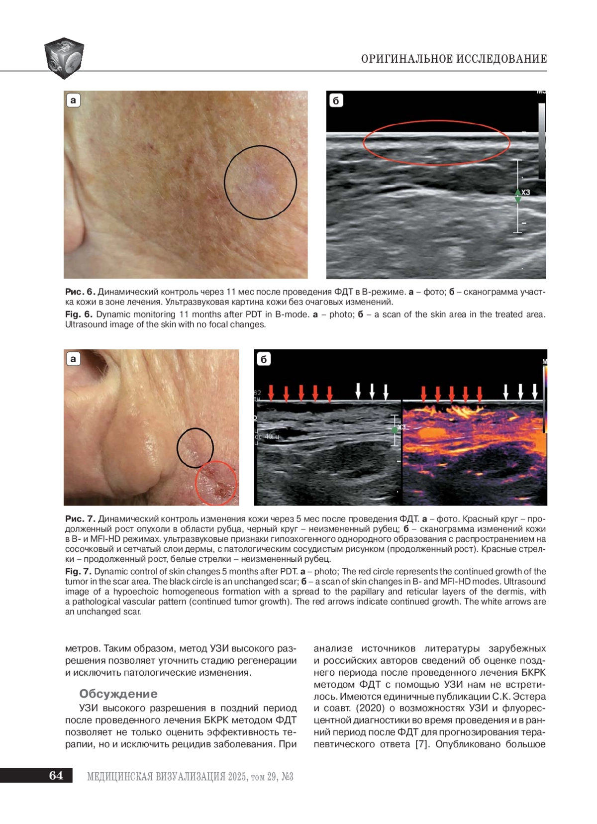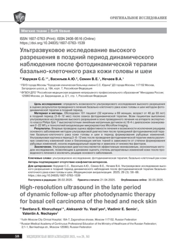 Результаты. Впервые проведена оценка эффективности лечения и возможности исключения рецидива основного заболевания методом ультразвуковой диагностики после проводимой фотодинамической терапии базально-клеточного рака кожи головы и шеи в период формирования рубцовых изменений. Ультразвуковая картина в период 3-6-12 мес после проведения фотодинамической терапии имела различную семиотику изменений кожи и близлежащих мягких тканей в зависимости от степени формирования рубцовых изменений, носила индивидуальный характер и зависела от множества факторов.