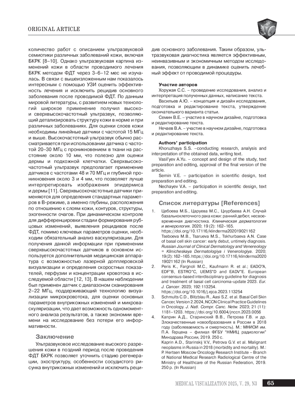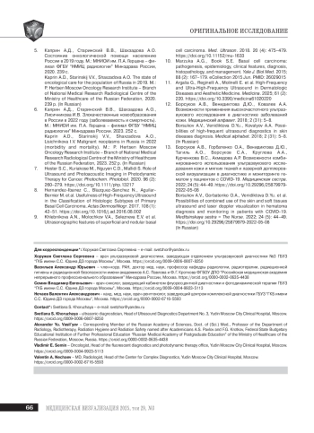 9. Khlebnikova A.N., Molochkov V.A., Selezneva E.V. et al. Ultrasonographic features of superficial and nodular basal cell carcinoma. Med. Ultrason. 2018. 20 (4): 475-479. DOI: 10.11152/mu-1633