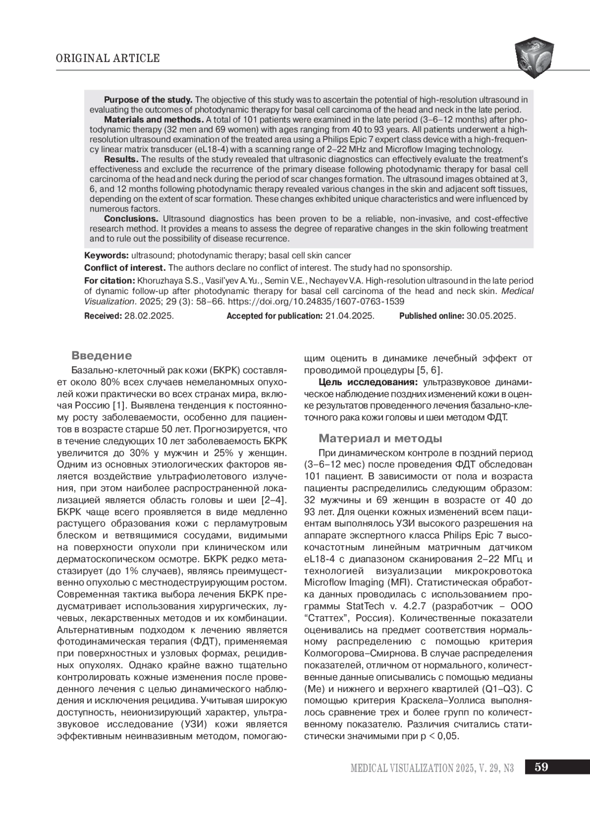 Материал и методы. Обследован 101 пациент (32 мужчины и 69 женщин, возраст от 40 до 93 лет) в поздний период (3-6-12 мес) после сеанса фотодинамической терапии. Всем пациентам выполнено ультразвуковое исследование высокого разрешения в зоне проведенного лечения на аппарате экспертного класса Philips Epic 7 высокочастотным линейным матричным датчиком eL18-4 c диапазоном сканирования 2-22 МГц и технологией визуализации микрокровотока Microflow Imaging.
