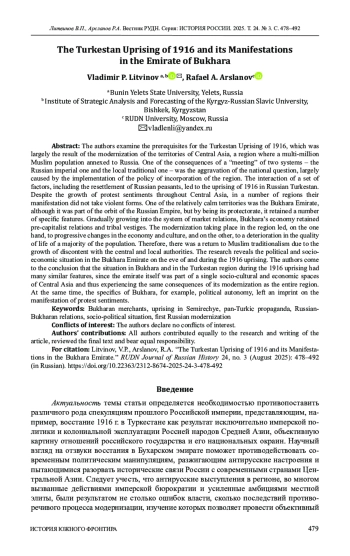 Рассмотрены предпосылки Туркестанского восстания 1916 г., ставшего во многом результатом модернизации присоединенных к России территорий Средней Азии с многомиллионным мусульманским населением. Одним из последствий «встречи» двух систем - российской имперской и местной традиционной - стало обострение национального вопроса, во многом вызванное проведением политики инкорпорации региона. Взаимодействие комплекса факторов, включавшего и переселение русских крестьян, привело к восстанию 1916 г. в Русском Туркестане. Несмотря на рост протестных настроений во всей Средней Азии, в ряде регионов их проявление не приняло насильственные формы. Одной из относительно спокойных территорий оставался Бухарский эмират, хотя и входивший в орбиту Российской империи, но, будучи ее протекторатом, сохранявший ряд специфических черт. Постепенно врастая в систему рыночных отношений, он сохранял докапиталистические отношения и родовые пережитки. Проходившая в регионе модернизация вела, с одной стороны, к прогрессивным изменениям в экономике и культуре, а с другой, - к ухудшению жизни большинства населения, обращению его к мусульманской традиции, к росту недовольства центральной и местной властями. Раскрыта политическая и социально-экономическая ситуация в Бухарском эмирате накануне и во время восстания 1916 г. Авторы пришли к выводу, что обстановка в Бухаре и в Туркестанском крае во время восстания 1916 г. во многом имела схожие черты, поскольку сам эмират входил в единое социокультурное и экономическое пространство Средней Азии, испытывая общие со всем регионом последствия его модернизации. Вместе с тем специфика Бухары, например политическая автономность, накладывала отпечаток на проявление протестных настроений.