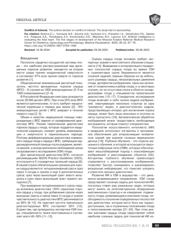 Материал и методы. Исследование проводилось на сроке беременности 18–21 нед. Каждое исследование на одного пациента содержало видеофайлы пяти стандартных проекций сердца. Каждый срез представлен не менее чем 25 кадрами. Верификация была выполнена путем подтверждения/изменения диагноза врачом-экспертом, а также подтверждением диагноза после рождения.