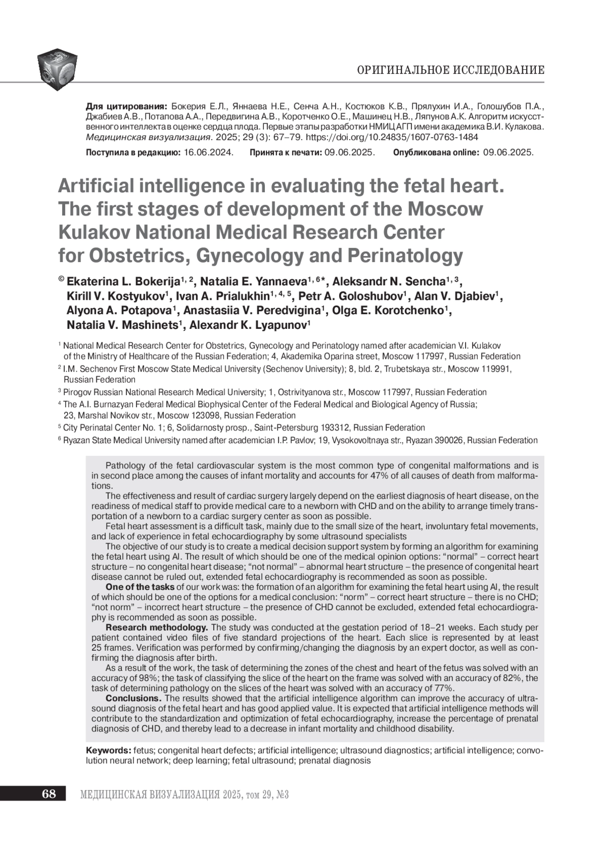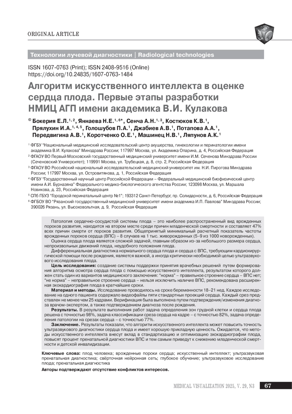 26. Han G., Jin T., Zhang L. et al. Adoption of Compound Echocardiography under Artificial Intelligence Algorithm in Fetal Congenial Heart Disease Screening during Gestation. Bionics Biomech. 2022: 2022: 6410103. DOI: 10.1155/2022/6410103