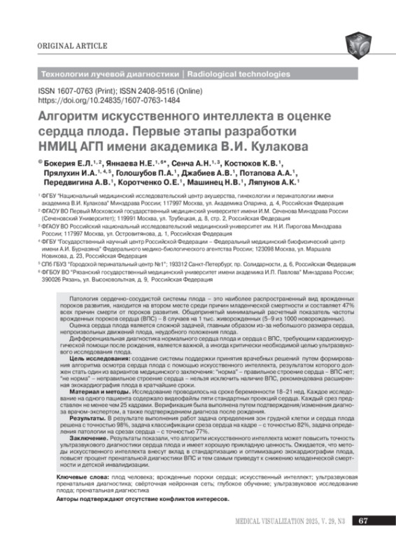 Заключение. Результаты показали, что алгоритм искусственного интеллекта может повысить точность ультразвукового диагностики сердца плода и имеет хорошую прикладную ценность. Ожидается, что методы искусственного интеллекта внесут вклад в стандартизацию и оптимизацию эхокардиографии плода, повысят процент пренатальной диагностики ВПС и тем самым приведут к снижению младенческой смертности и детской инвалидизации.